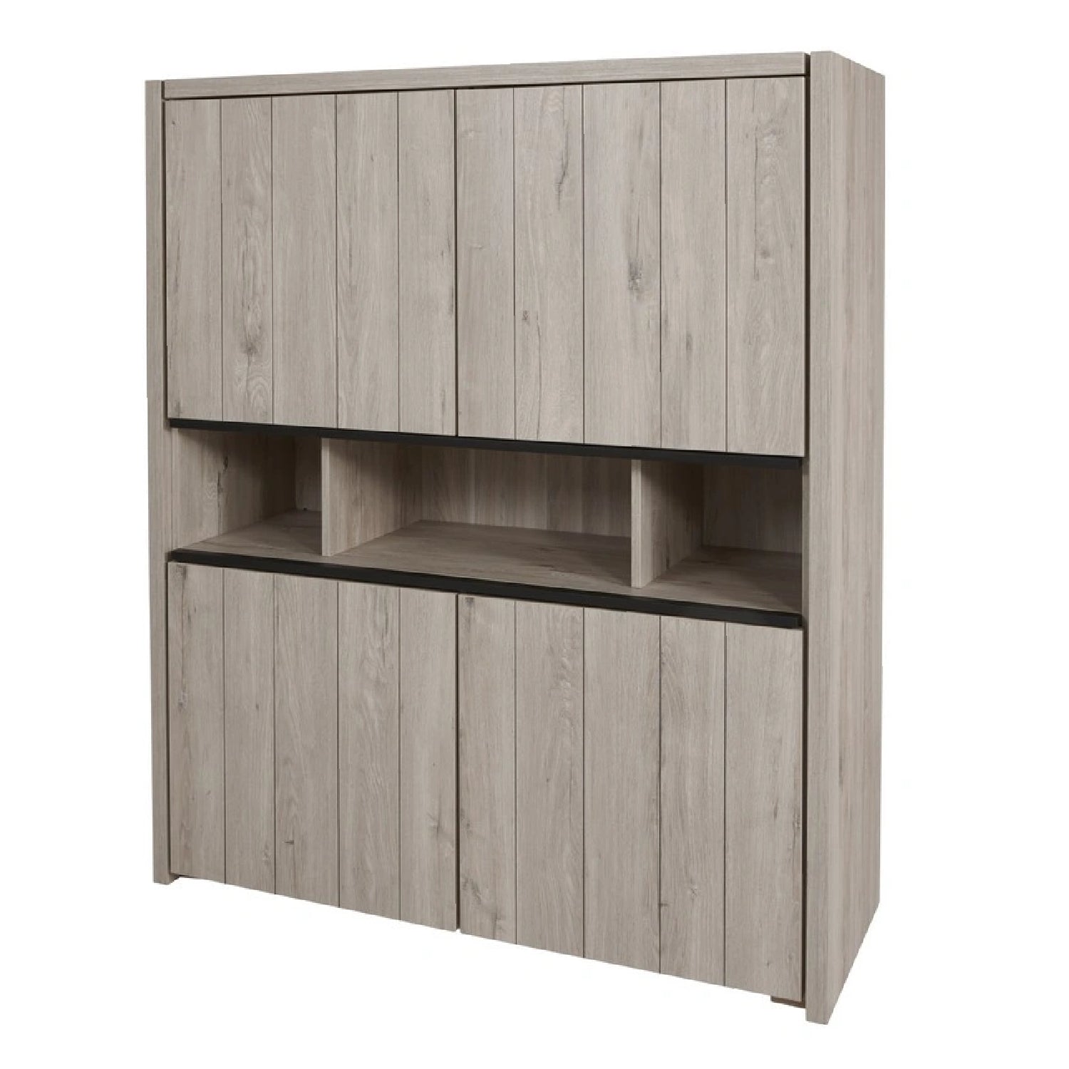 Dit dressoir, opgebouwd uit een harmonieus samenspel van lichtgrijs houtdecor...