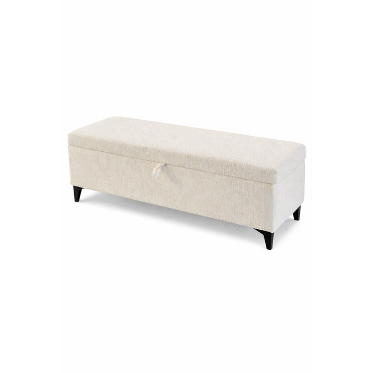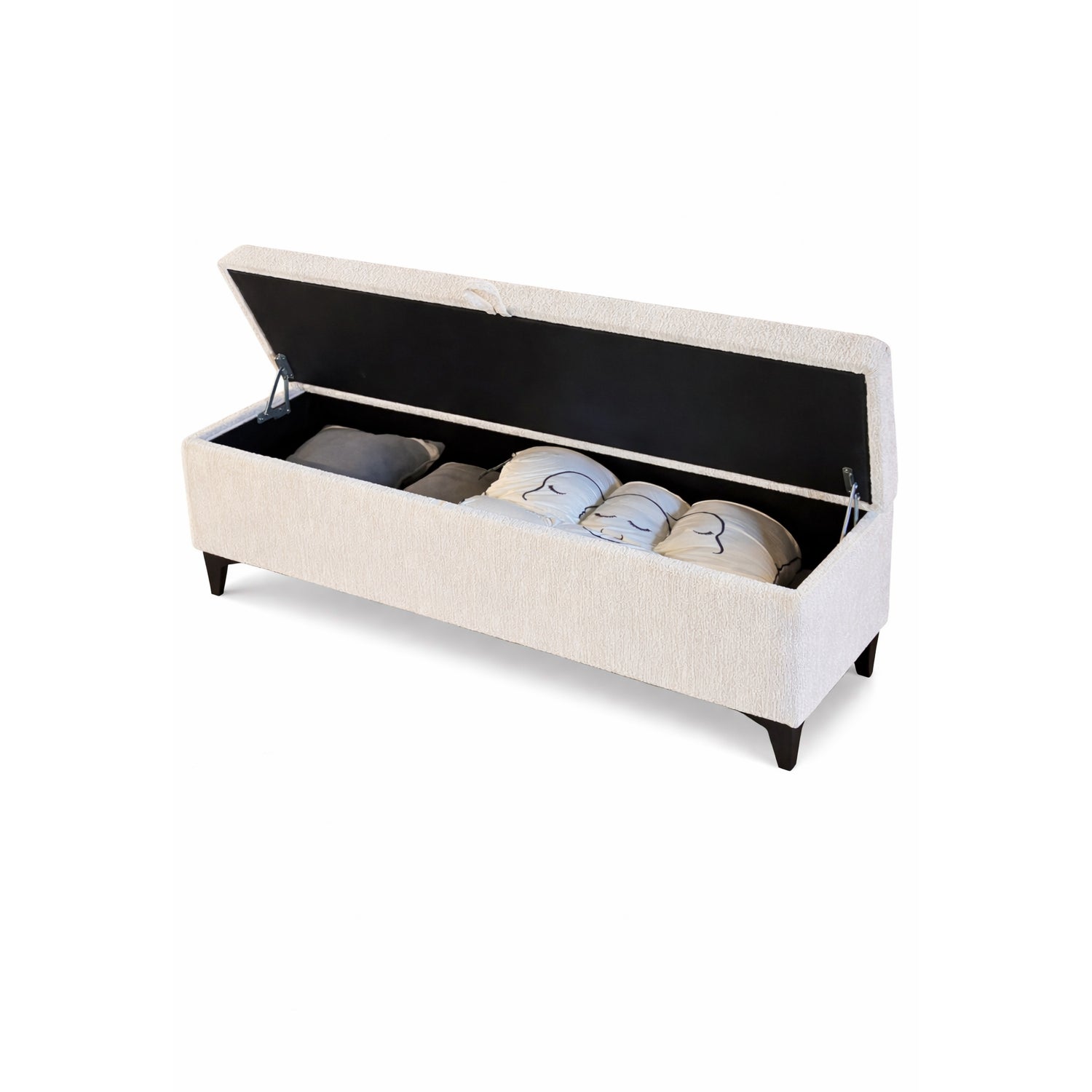 Dankzij de ruime opbergruimte onder de zitting is de poef niet alleen een stijlvolle blikvanger aan het voeteneinde van het bed, maar ook een praktische oplossing voor het opbergen van kussens, plaids of beddengoed. De zachte bekleding en strakke afwerking geven de poef een luxe hoteluitstraling, terwijl de slanke zwarte poten zorgen voor een modern contrast.