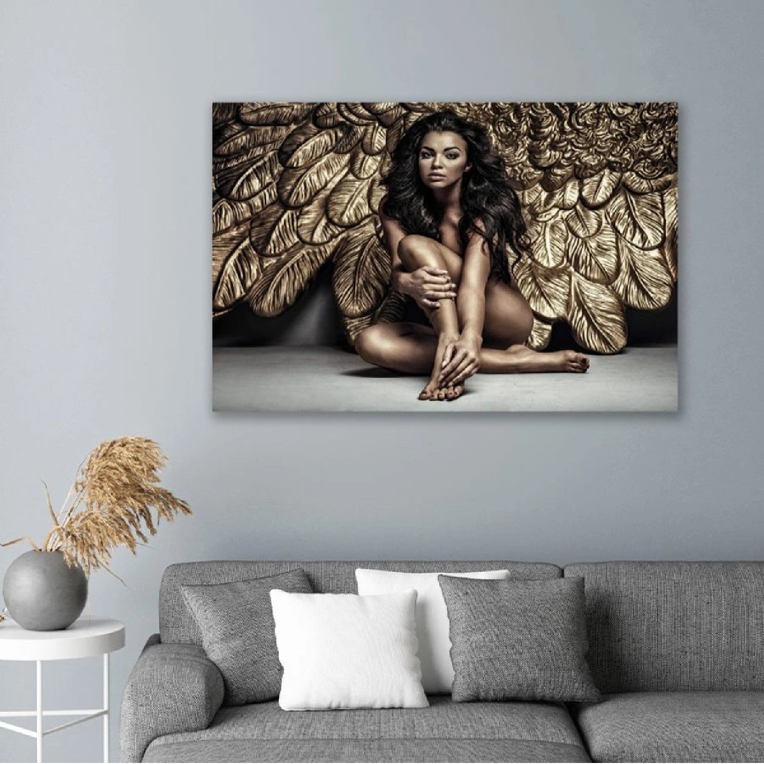 Deze krachtige compositie van een vrouw met imposante gouden vleugels straalt pure