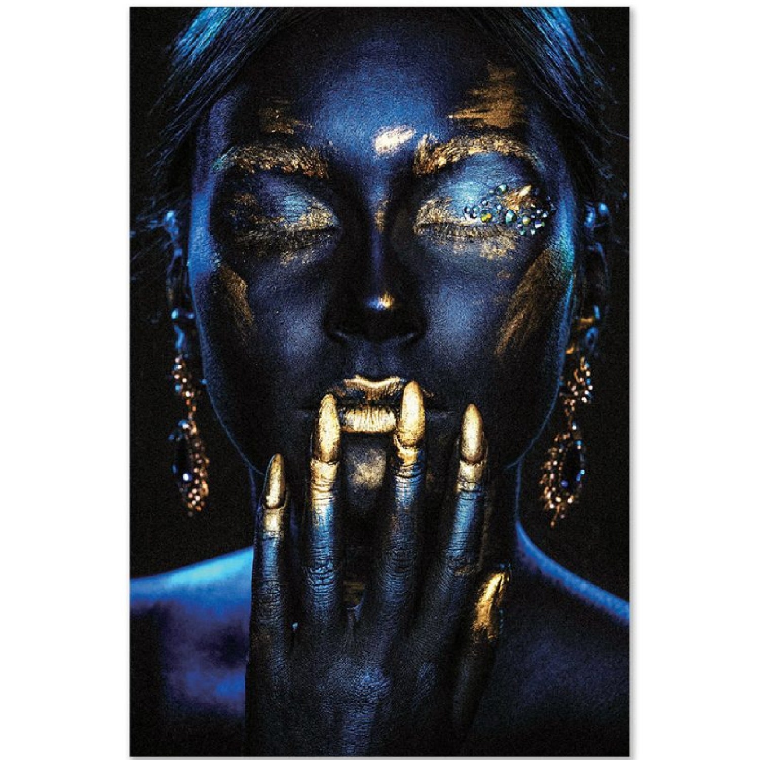 vrouwelijk gezicht bedekt in nachtblauw met dramatische goudaccenten op