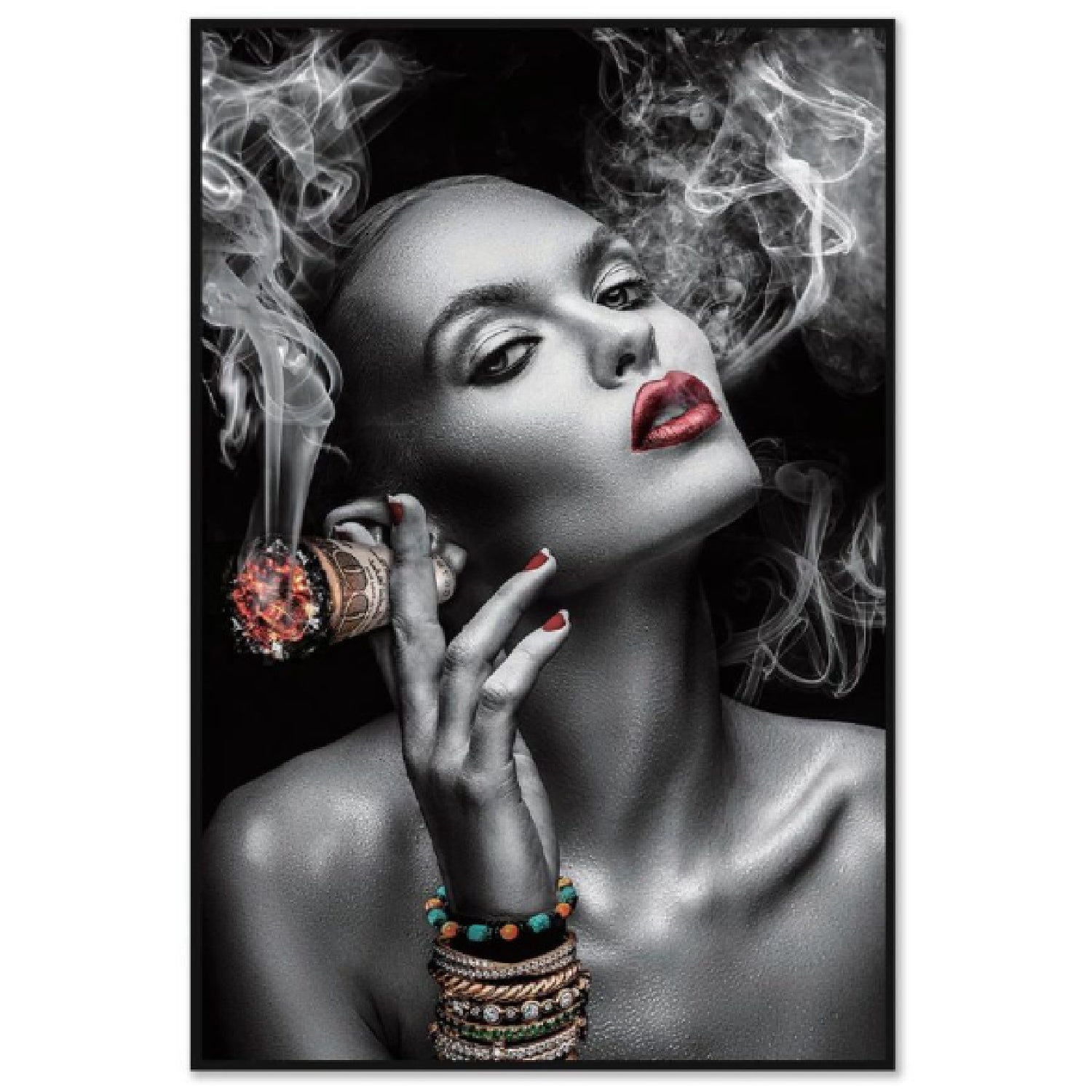 een iconische vrouw met vlammende rode lippen en een brandende sigaar van geld,