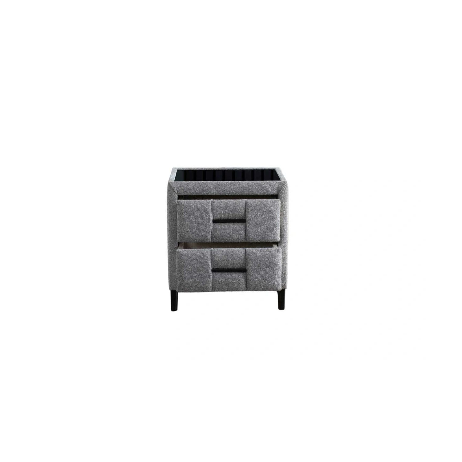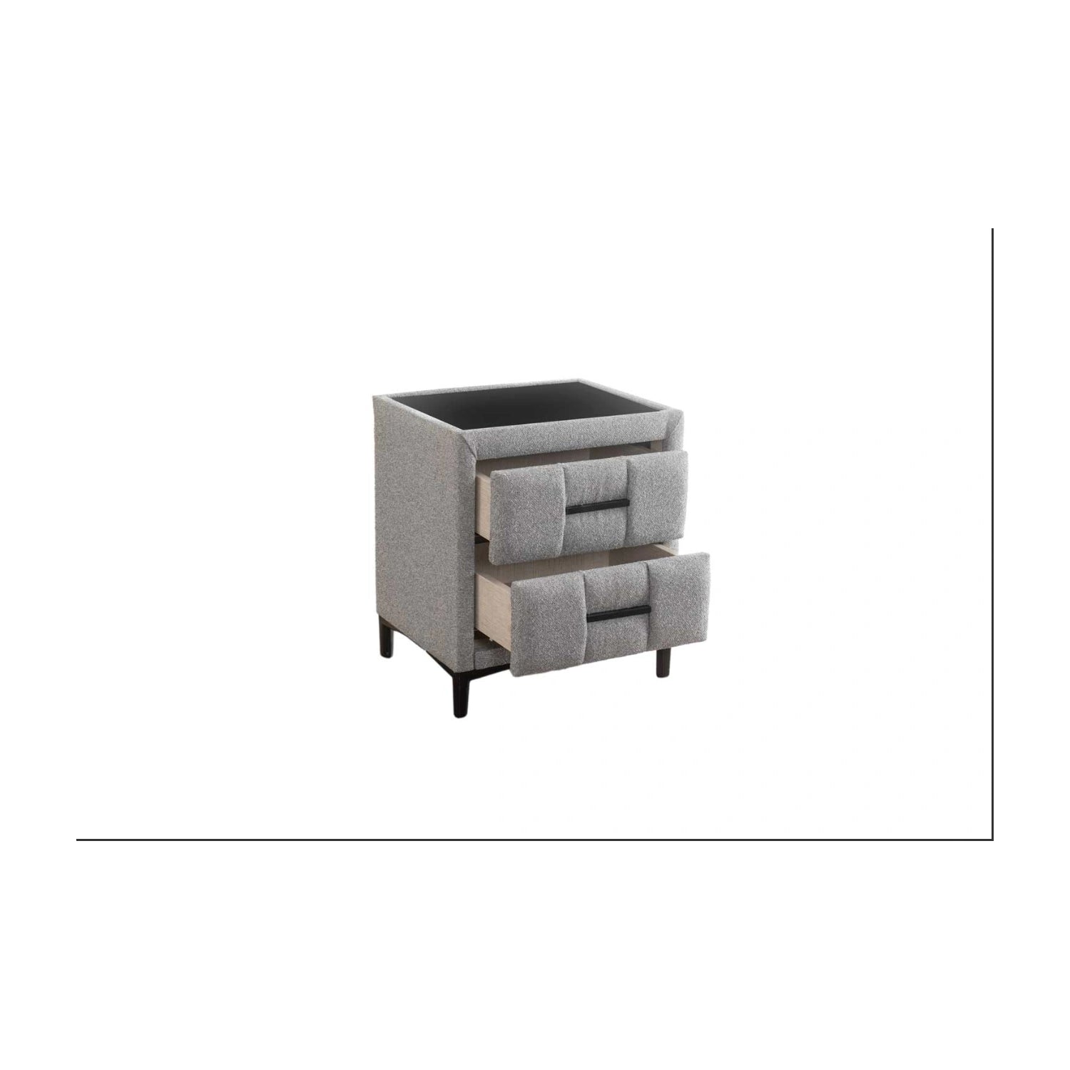 doorloopt in de laden zorgt voor een harmonieus geheel dat zachtheid uitstraalt, terwijlhet gladde, zwarte bovenblad een mooi contrast biedt en praktisch gebruiksgemak