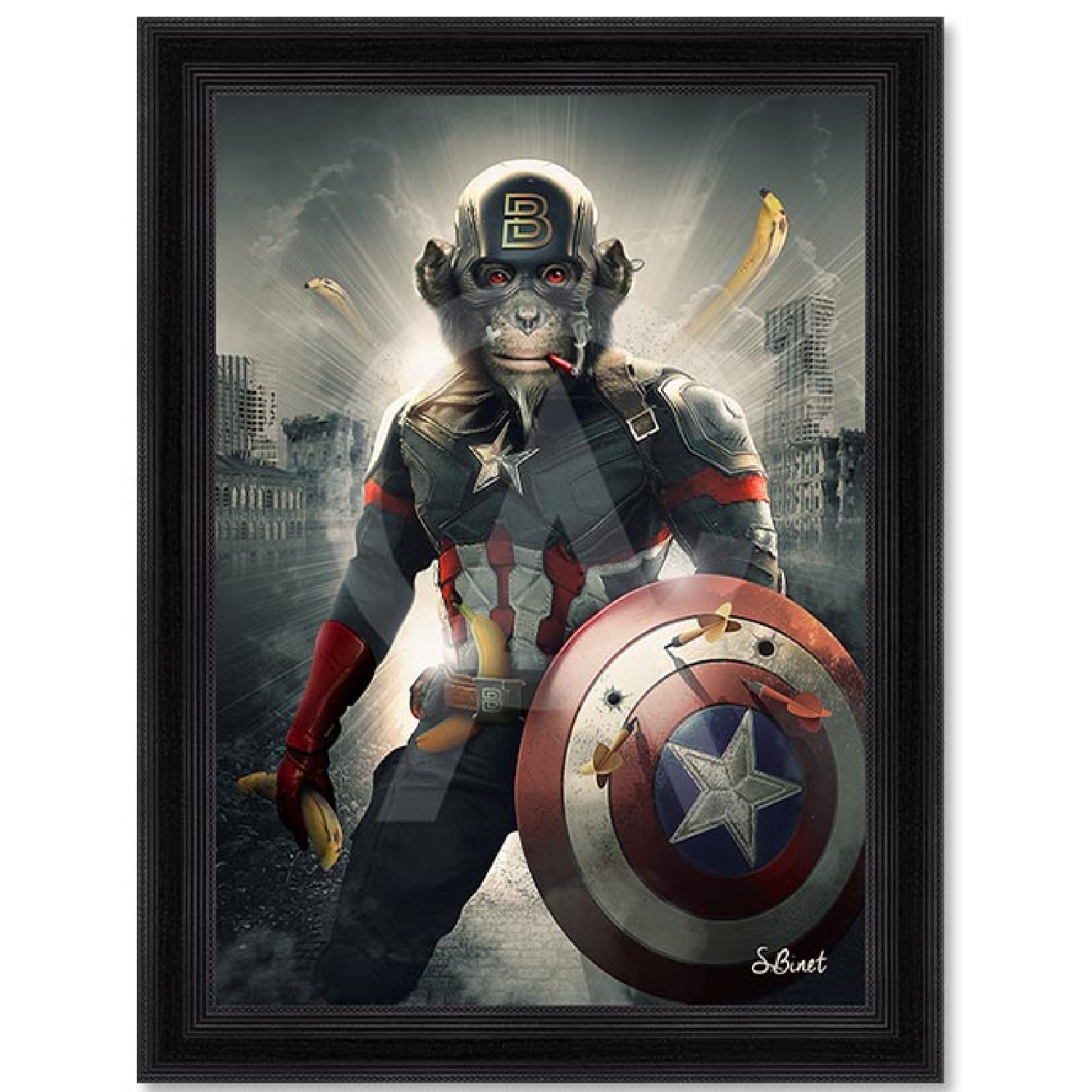 bananen als wapens, staat hij stoer in een vervallen stadsdecor. De “B” op zijn