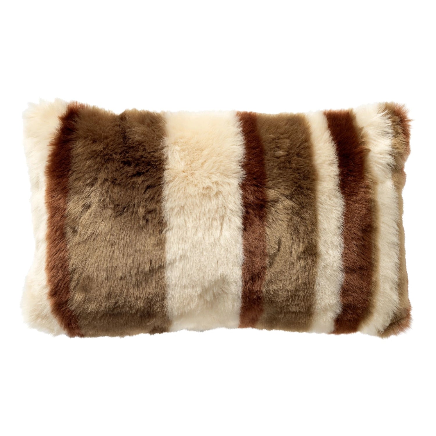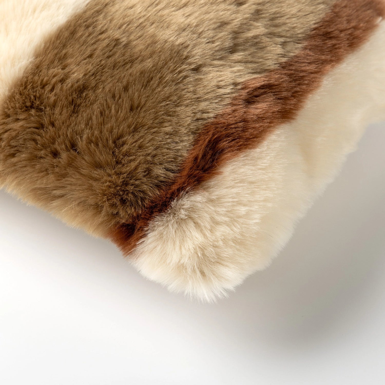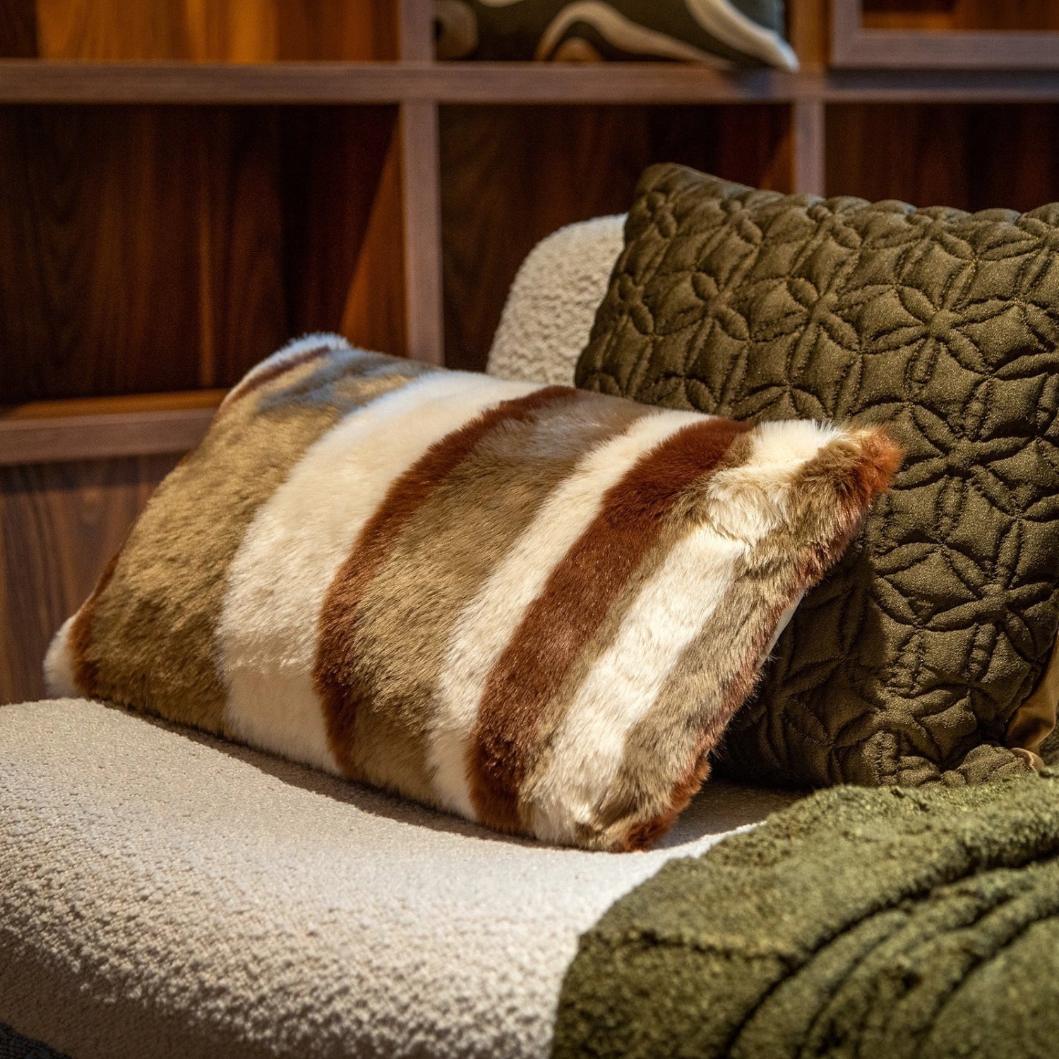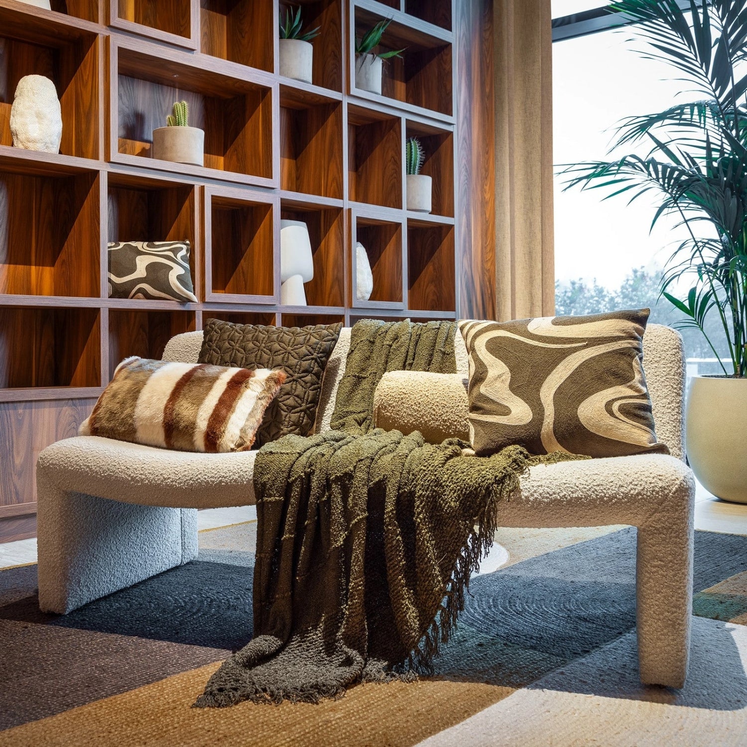 Een subtiel statement van elegantie: dit sierkussen omhult zich in rijke tinten, als penseelstreken op een zijdezacht canvas. De fluweelachtige vachtstructuur aan de voorzijde voegt een tastbare diepte toe, die uitnodigt tot aanraken zonder afbreuk te doen aan zijn verfijnde uitstraling. De achterkant vormt een kalme tegenhanger: uitgevoerd in effen, zacht fluweel in warme crèmetint. Perfect gedimensioneerd voor stijlvolle gelaagdheid – een accessoire dat zachtheid en klasse moeiteloos verweeft.