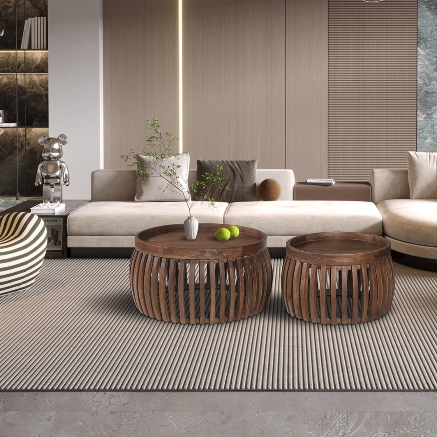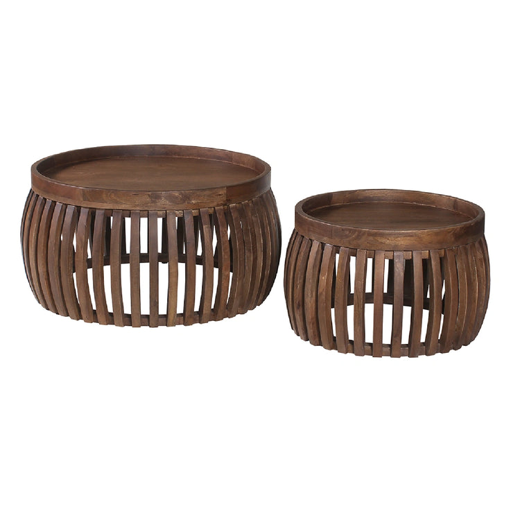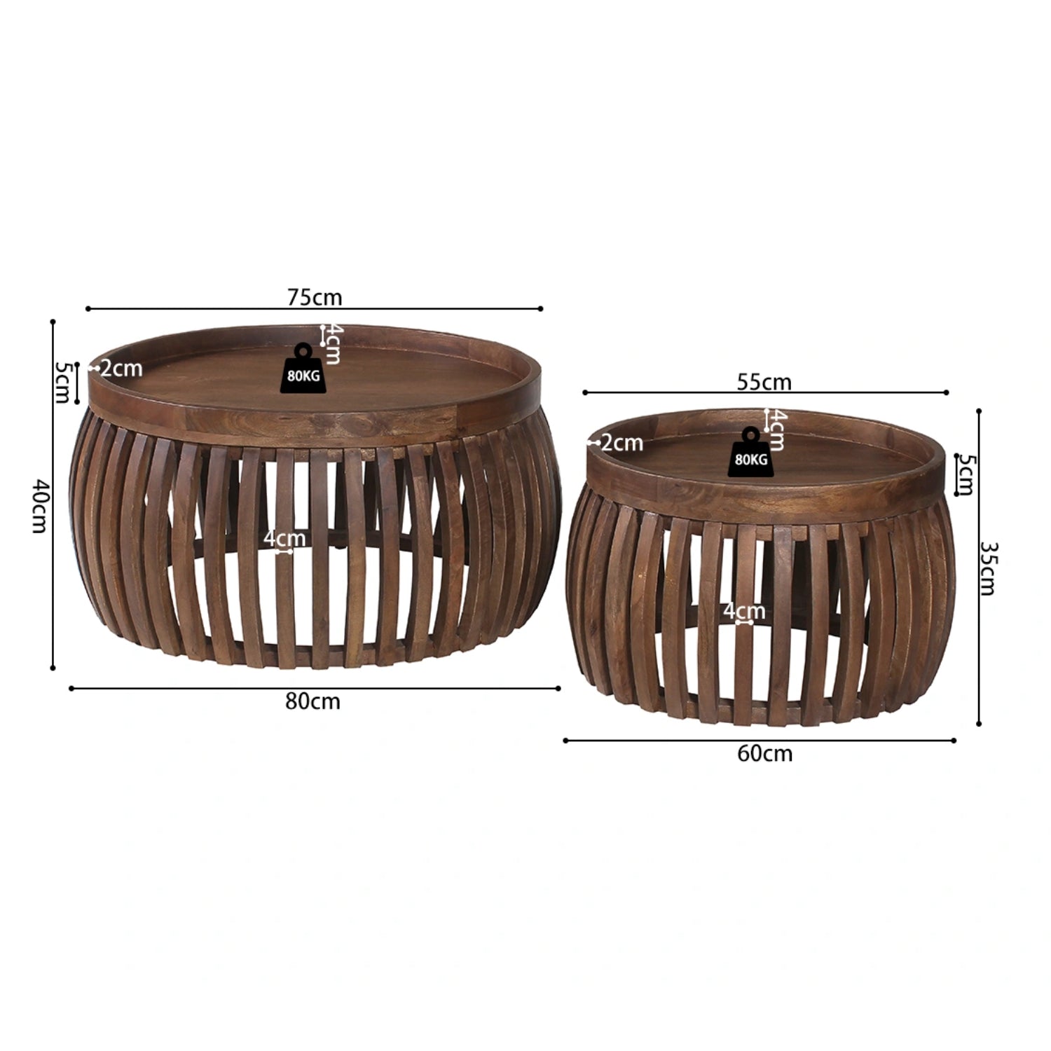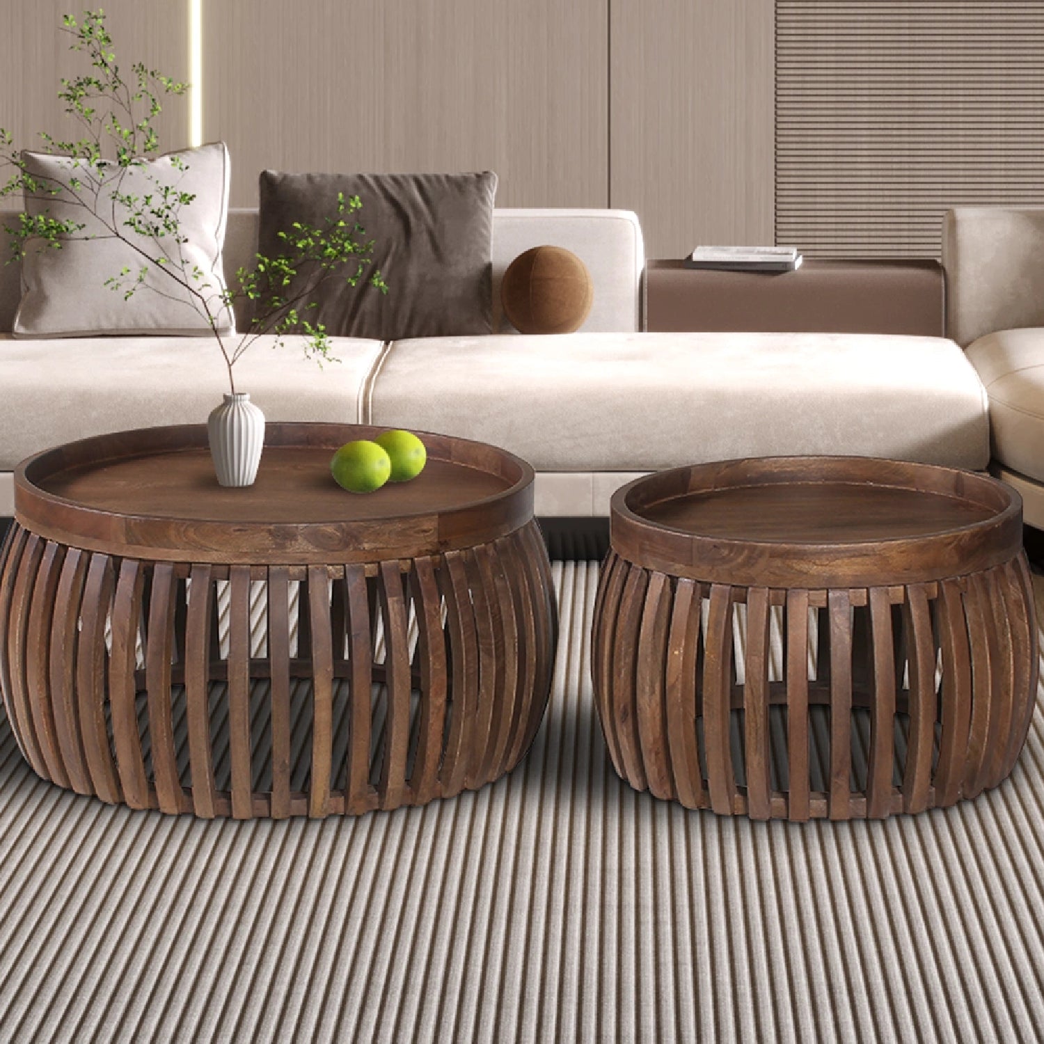 Twee tafels, één verhaal. Lichtbruin mangohout met een levendige nerf, ronde