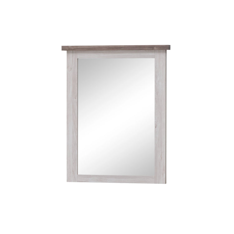lichte white oak kader omarmt de spiegel subtiel, terwijl het bovenste accent in