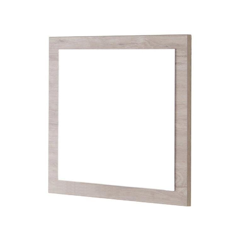 Deze minimalistische wandspiegel van lichtgrijze houtstructuur met