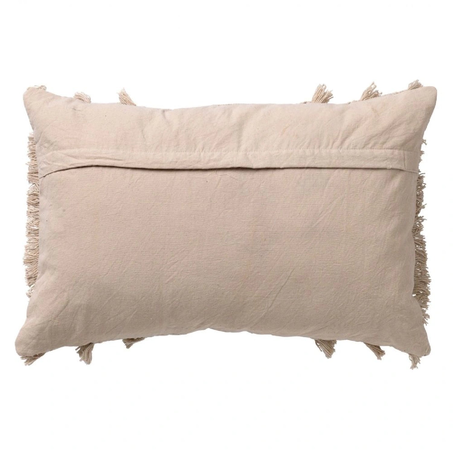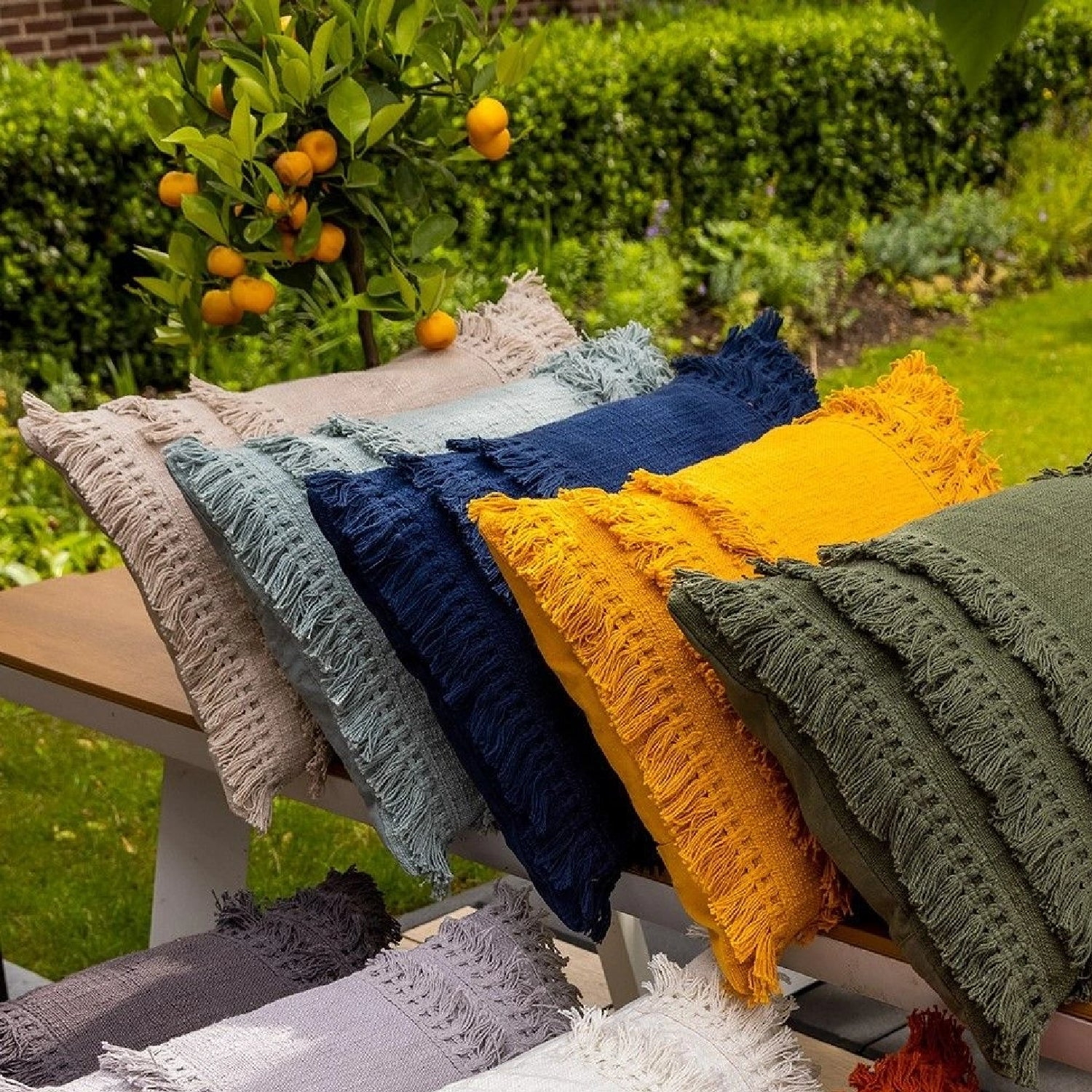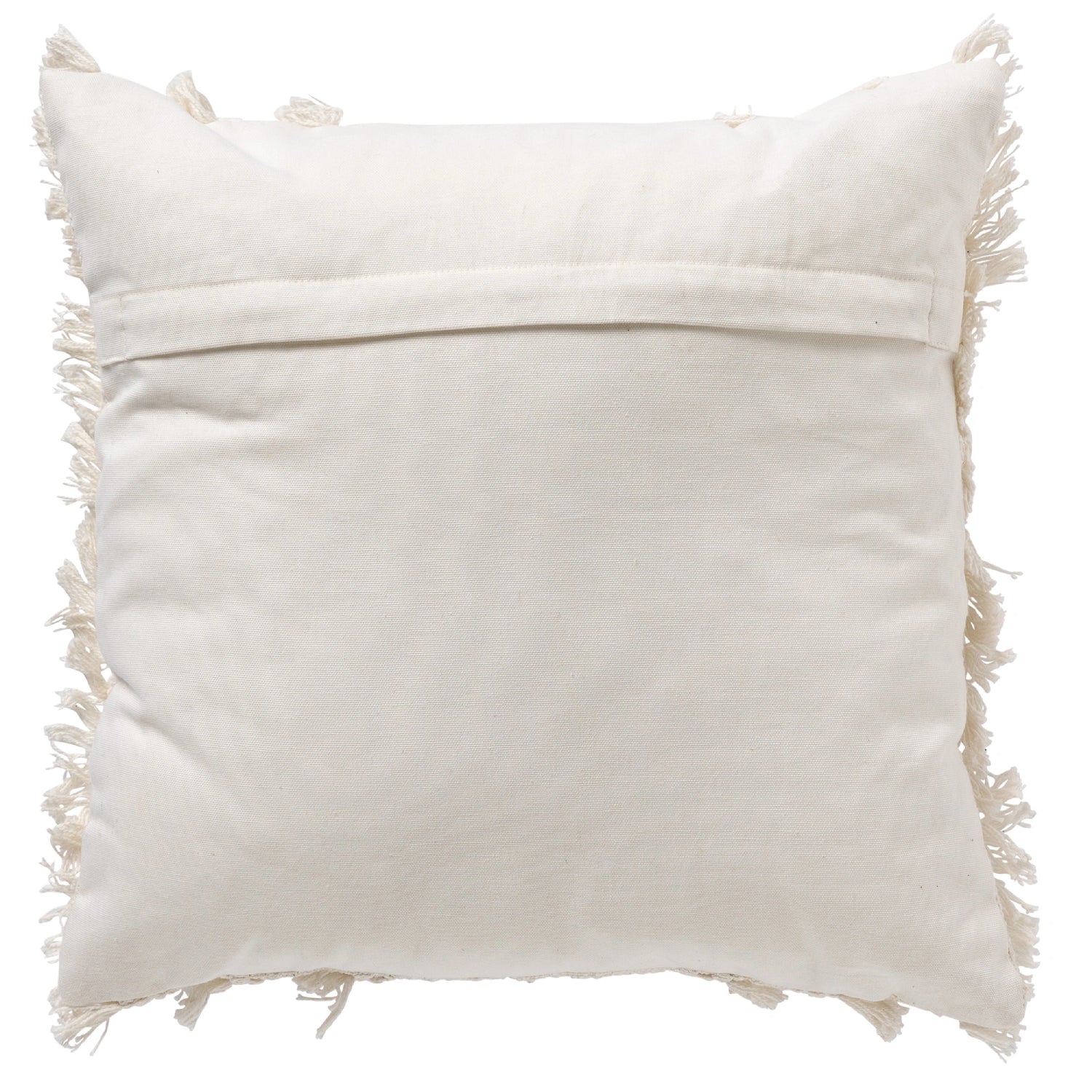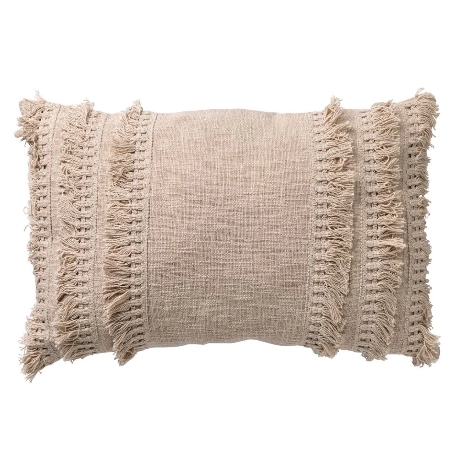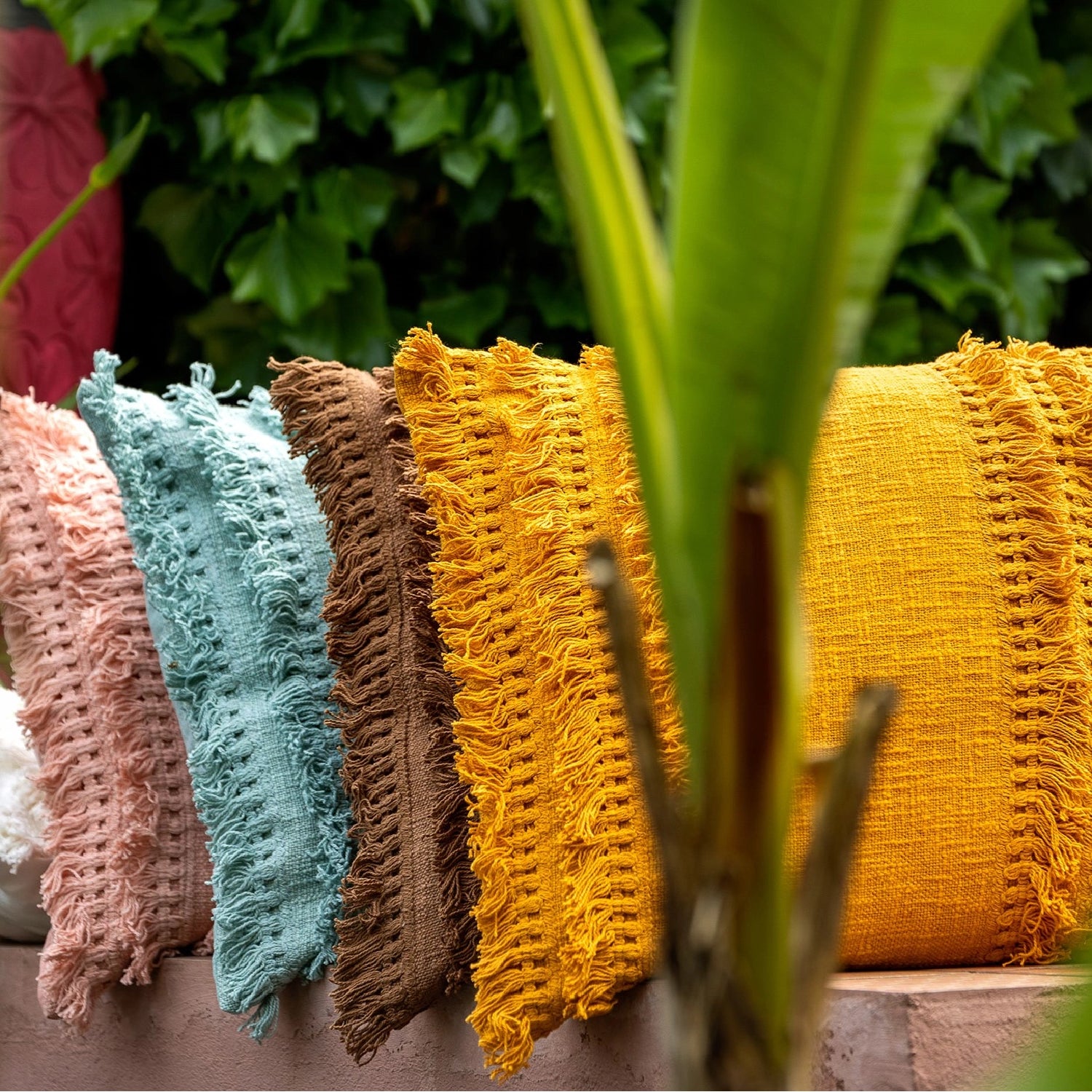 Een vleugje ambacht met een moderne ziel — dit sierkussen brengt structuur en zachtheid samen. De voorzijde is speels afgewerkt met grof geweven banen en speelse franjes, terwijl de achterkant rust biedt in een effen, gladde katoenen stof. Een stijlvol accent dat ingetogen karakter toevoegt aan je interieur.