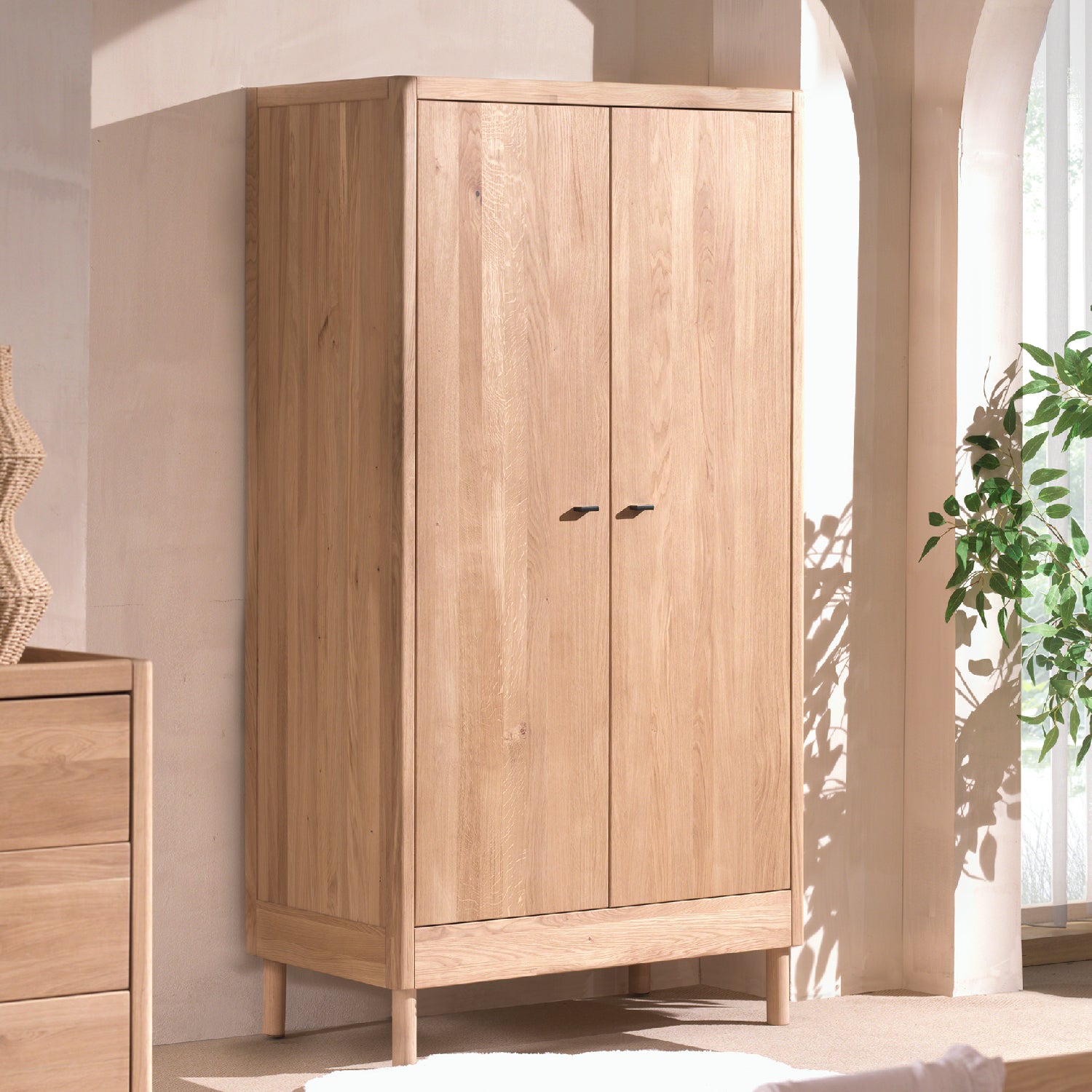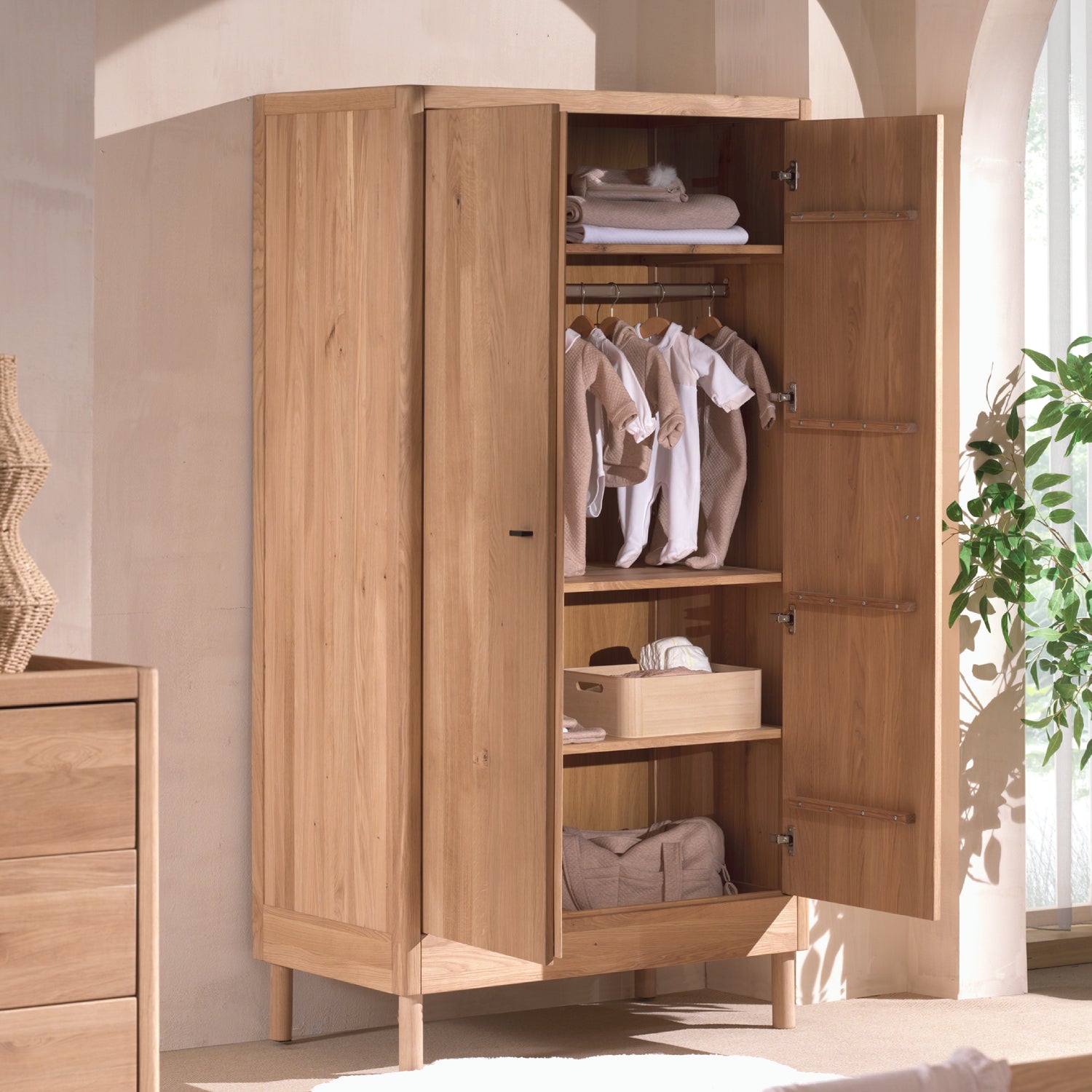 Deze garderobekast in massieve hout ademt warmte en natuurlijk karakter, met een