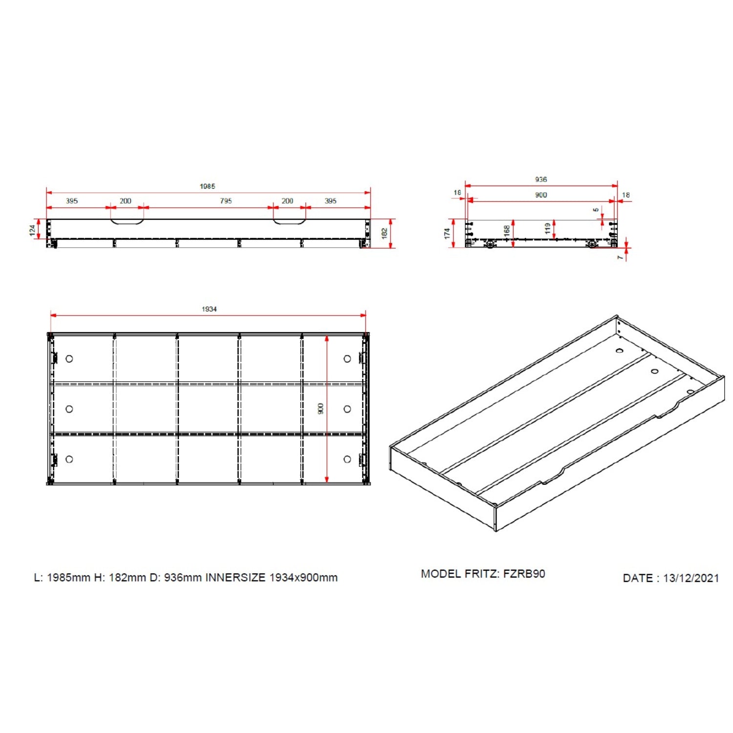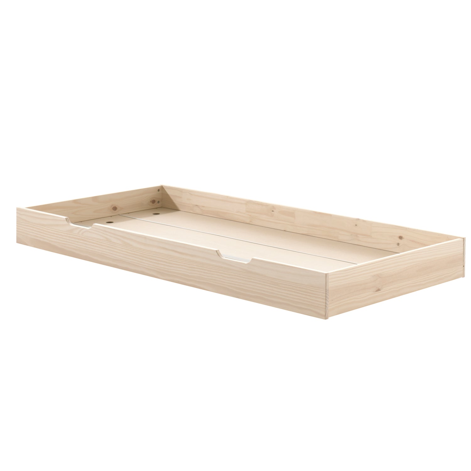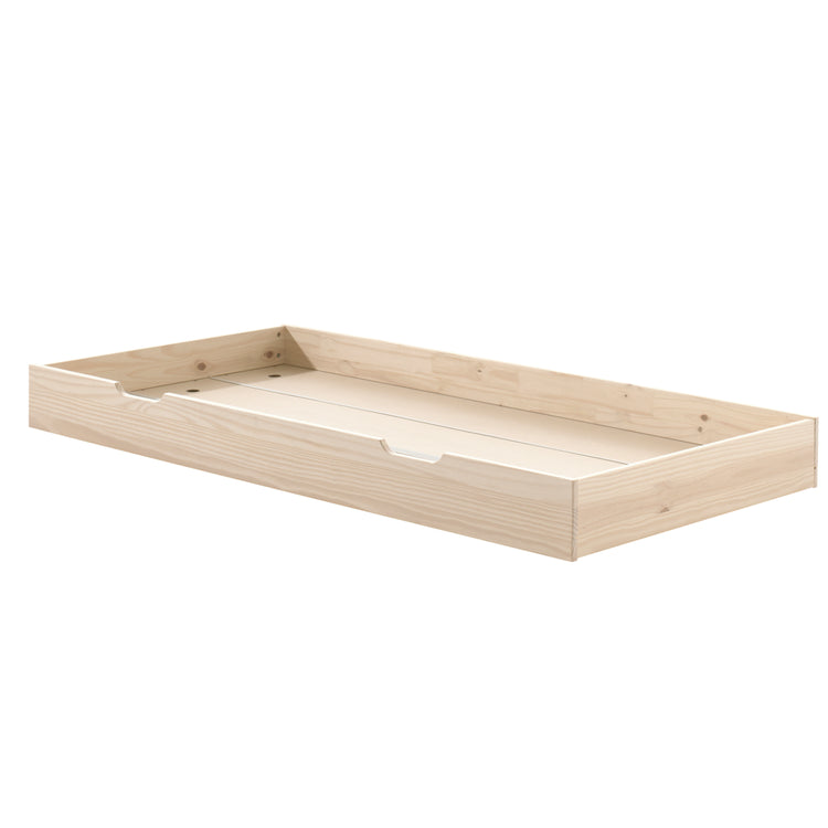 Gemaakt uit dezelfde hoogwaardige hout en sluit naadloos aan bij het tijdloos ontwerp van het bed. De lade is breed en diep, ontworpen om onzichtbaar weg te schuiven onder het bedframe, waardoor ze discreet opgaat in het geheel zonder het luchtige karakter van het ontwerp te doorbreken. De zichtbare voorzijde is afgewerkt met verticale lijnen die perfect
