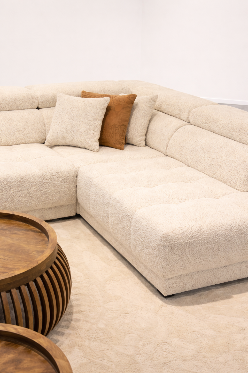 Deze royale hoekzetel straalt rust en comfort uit dankzij het zachte bouclé-materiaal en het tijdloze Scandinavische design. De lichte tinten en ronde vormen zorgen voor een warme, uitnodigende uitstraling die perfect past in een modern en natuurlijk interieur. Dankzij de verstelbare hoofdsteunen geniet je bovendien van extra ergonomisch comfort, afgestemd op jouw zithouding.