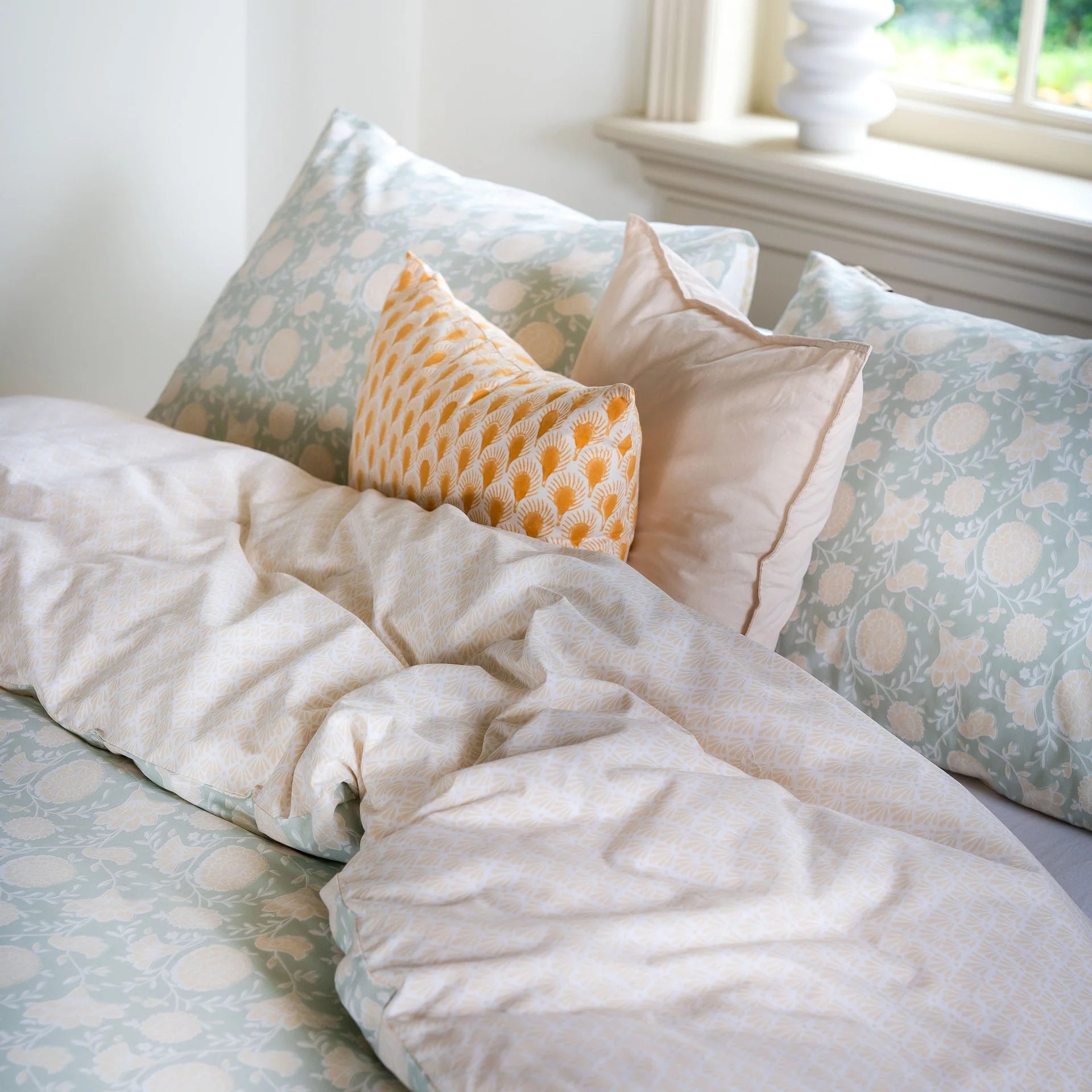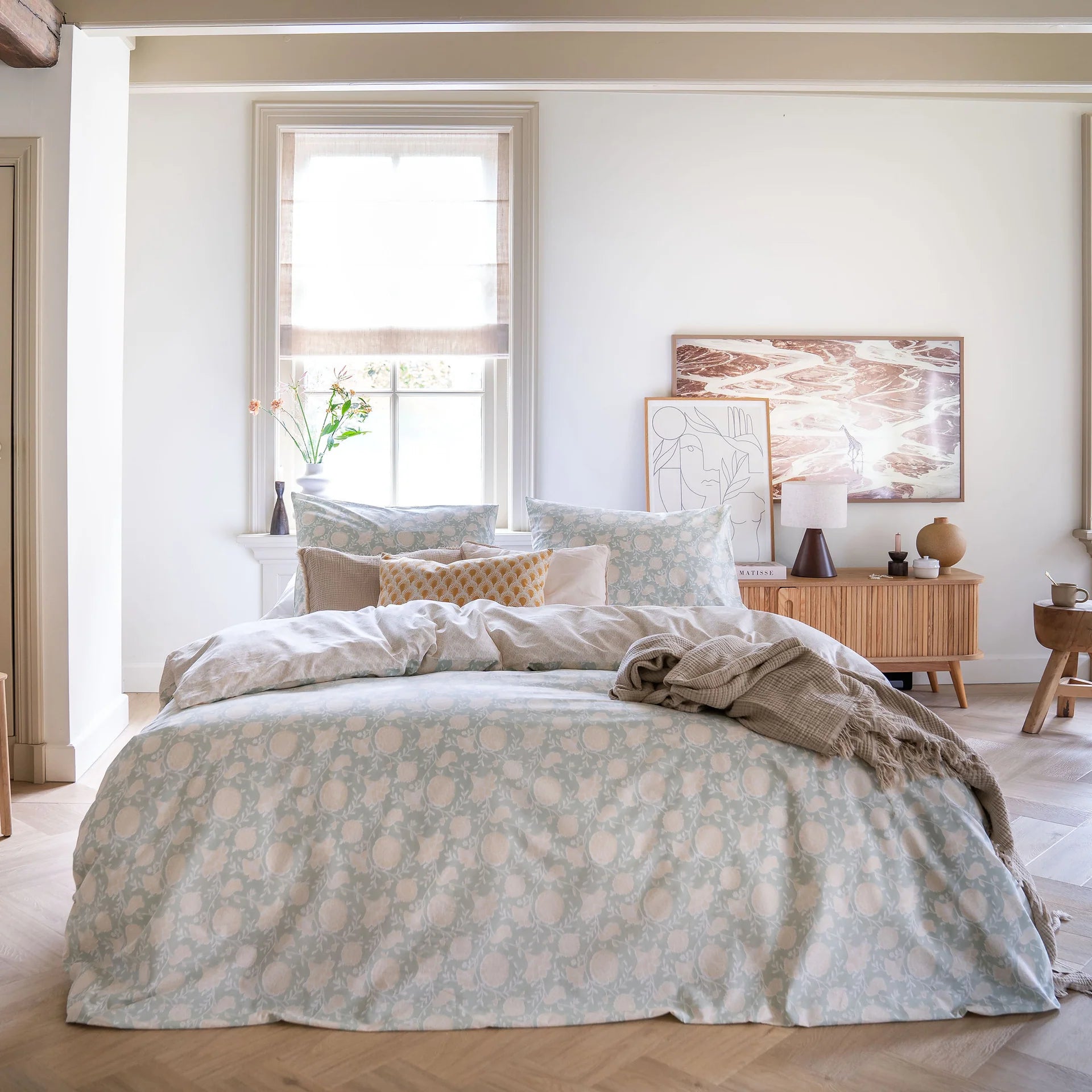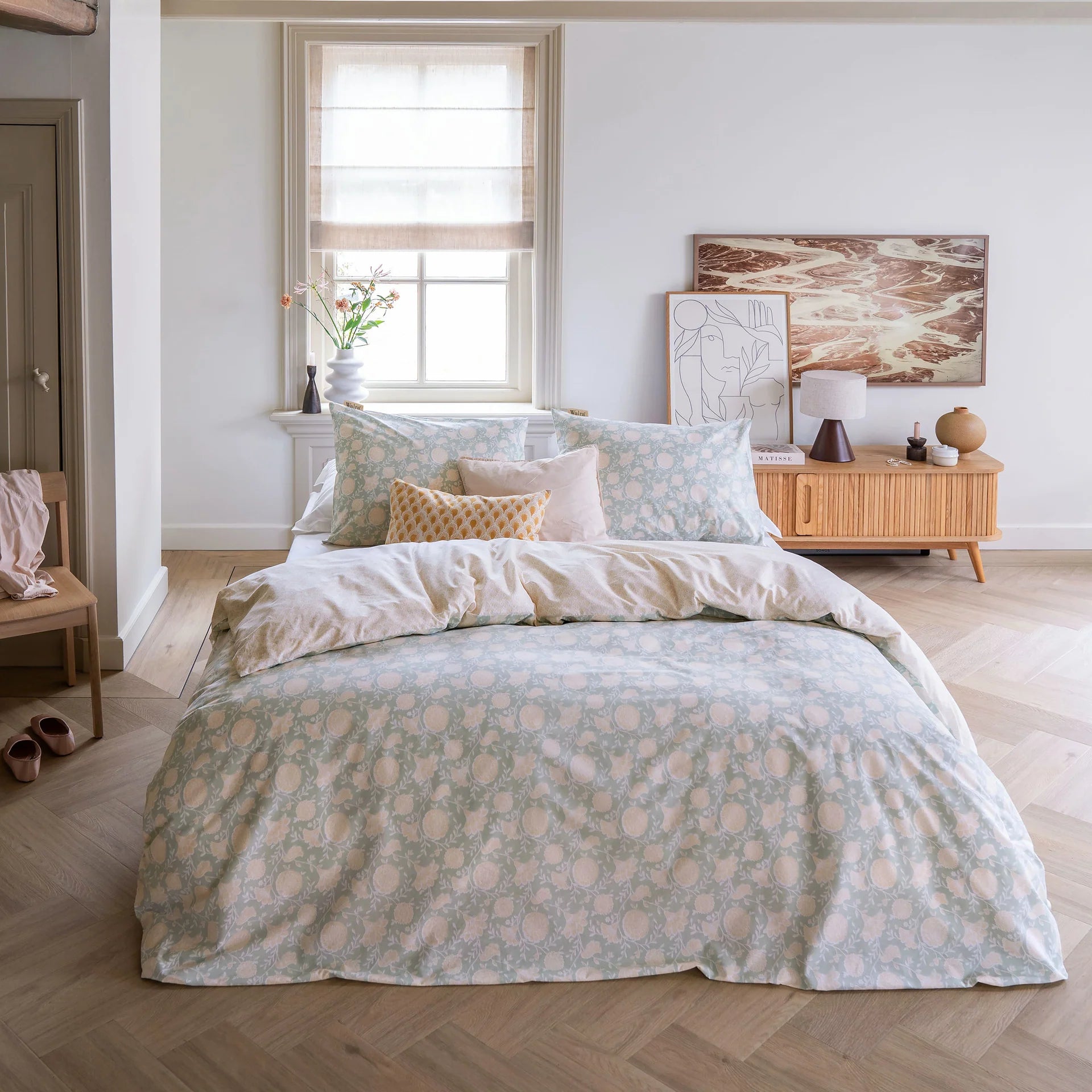beddengoed speelt subtiel met zachte tinten van jadegroen en verfijnd beige,