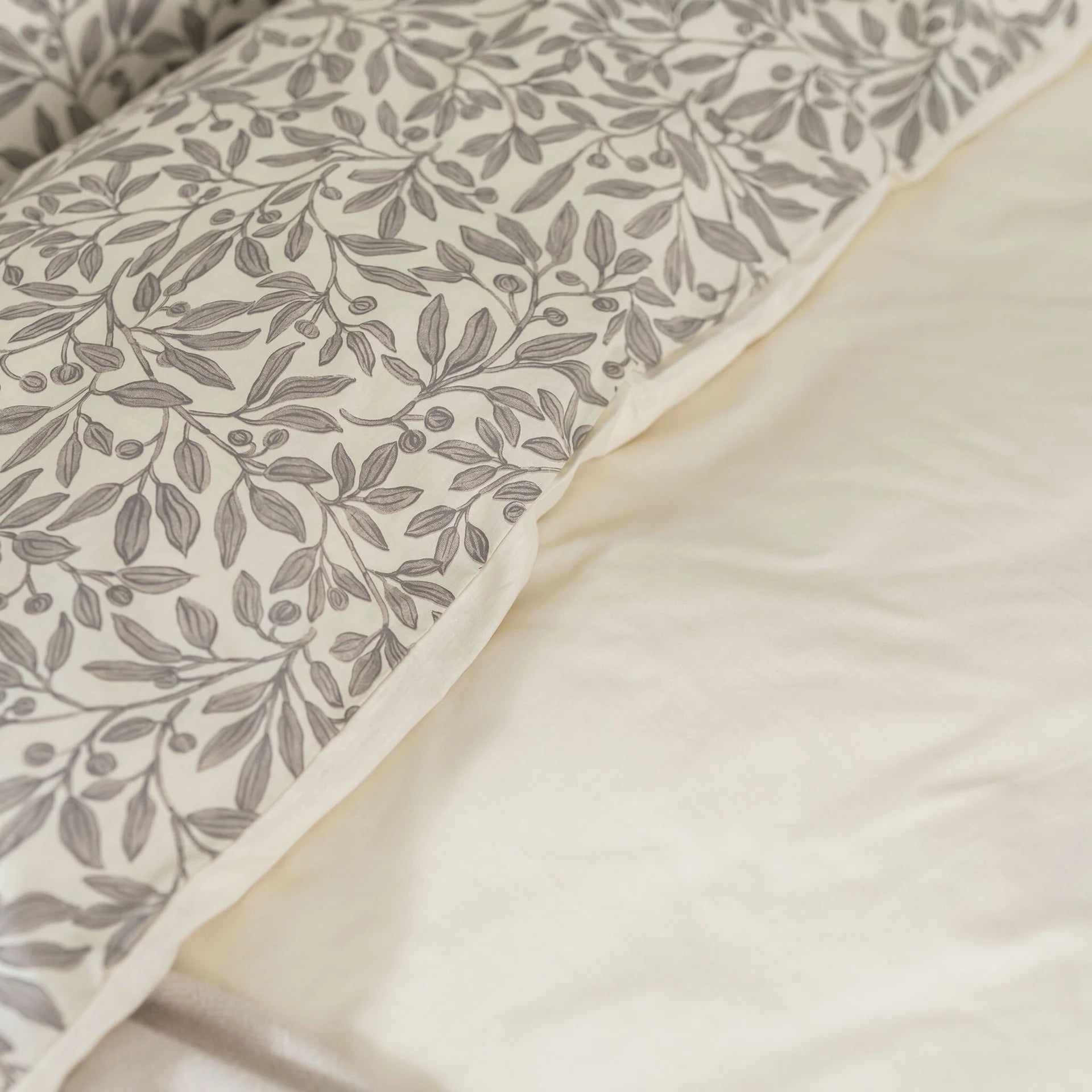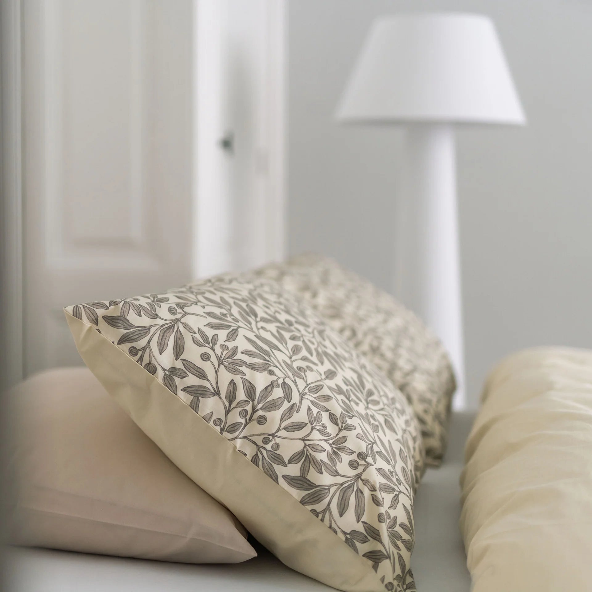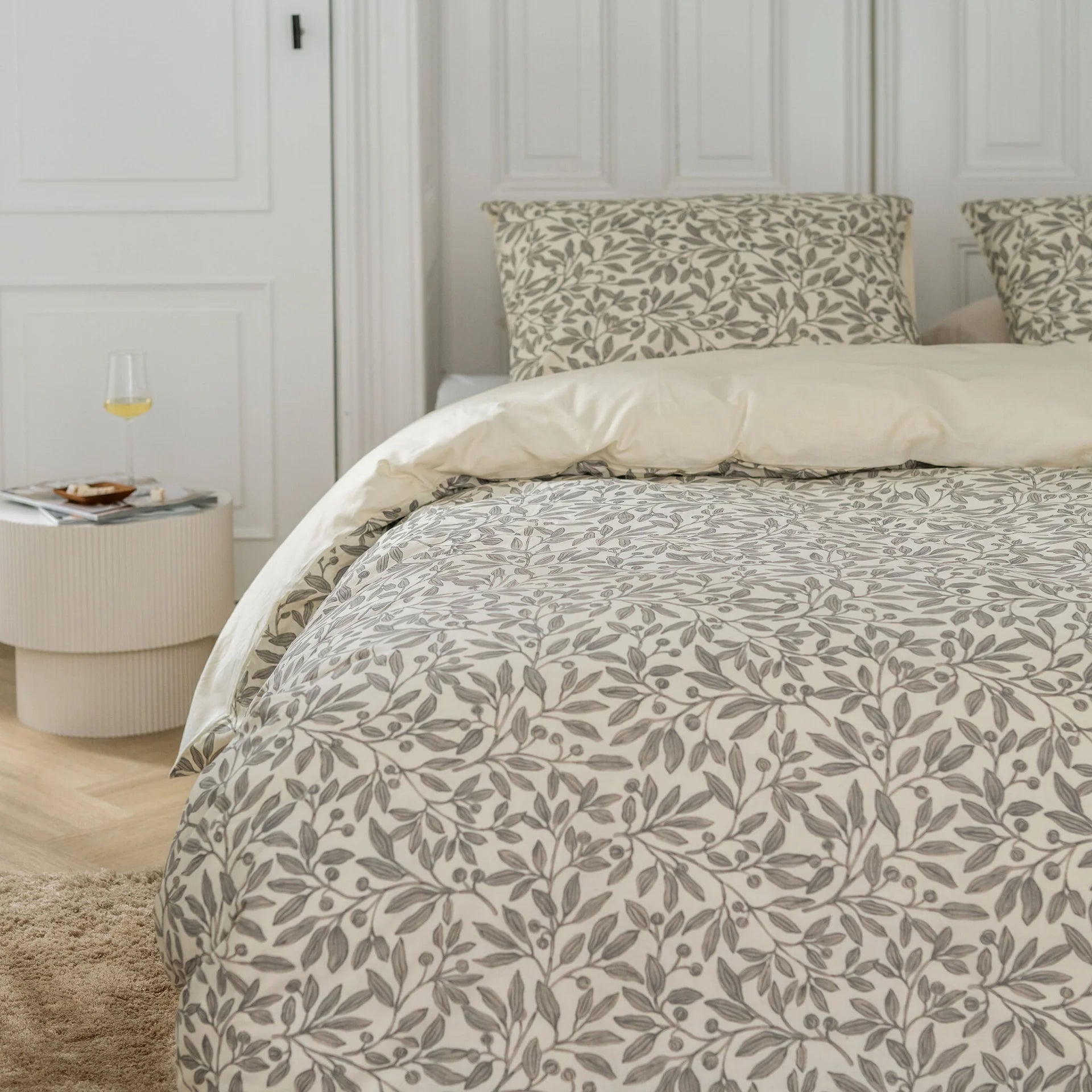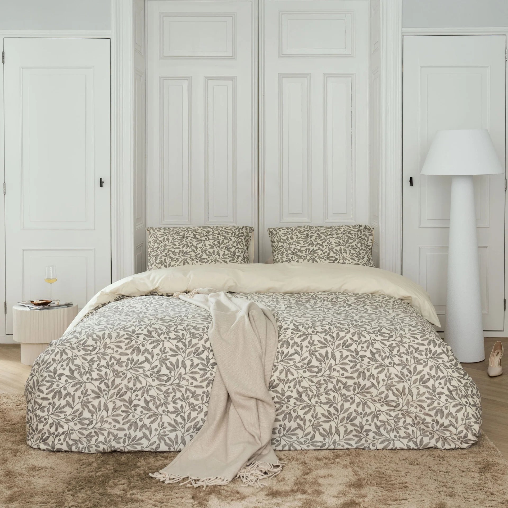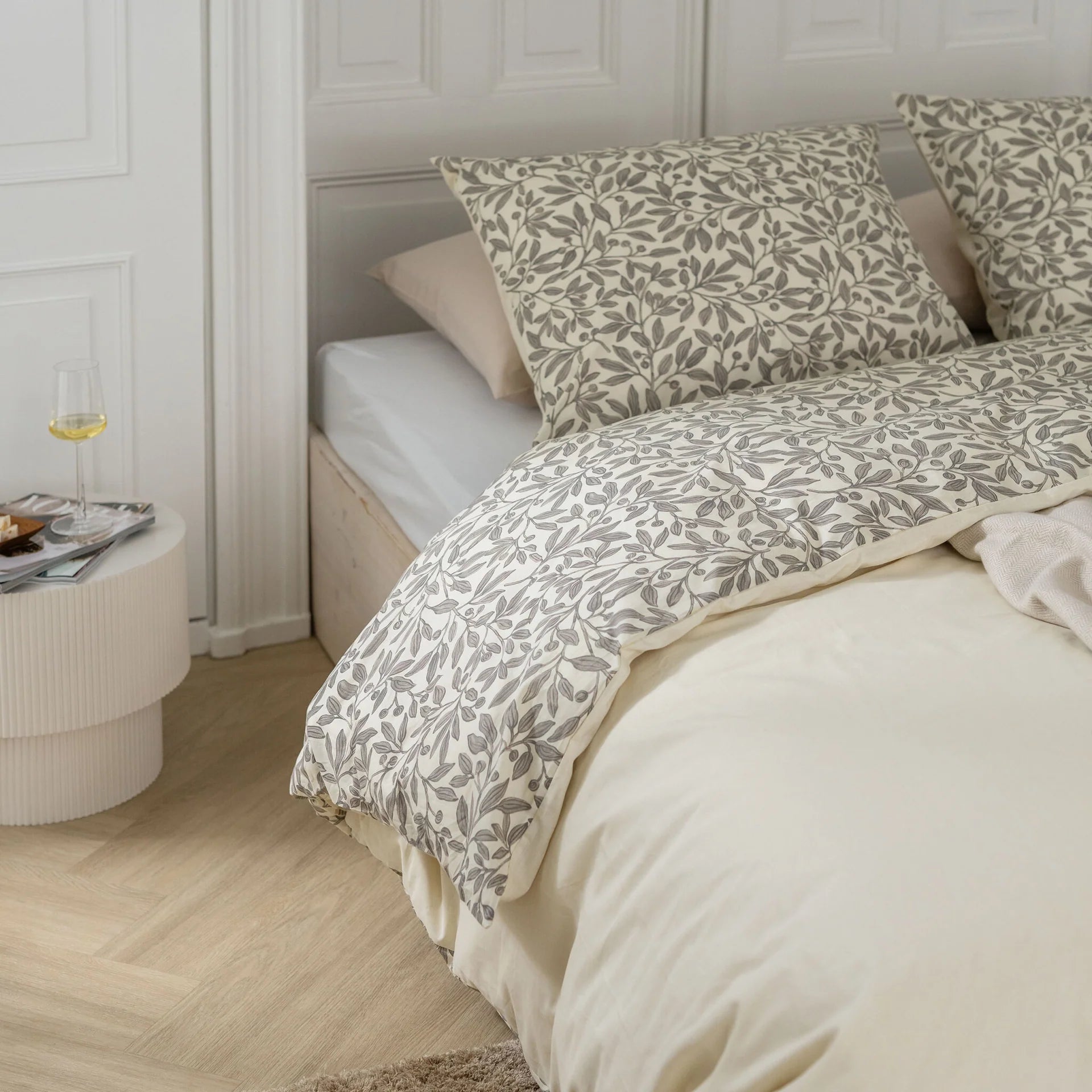 Met zachte en kalme elegantie transformeert dit beddengoed je slaapkamer tot een plek van rust en verfijning. De delicate bladeren, subtiel verspreid over de stof in natuurlijke aardetinten, zorgen voor een serene sfeer die het gevoel geeft alsof je midden in een betoverend bos ontwaakt. De achterzijde vormt een verfijnde tegenhanger met een effen zachte kleur, waardoor je de keuze hebt tussen uitbundige botanische charme of ingetogen minimalisme, passend bij jouw stemming en interieur.