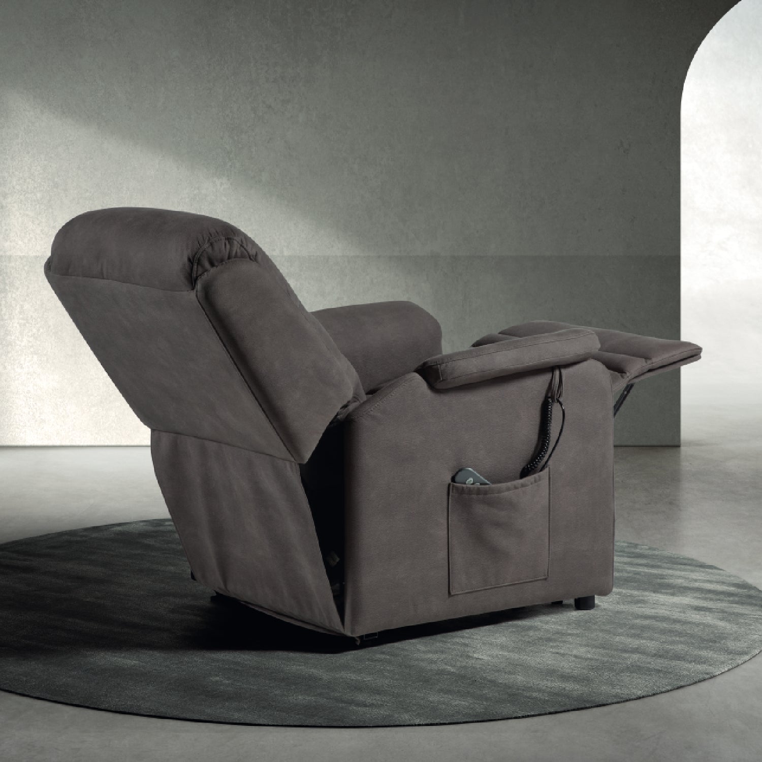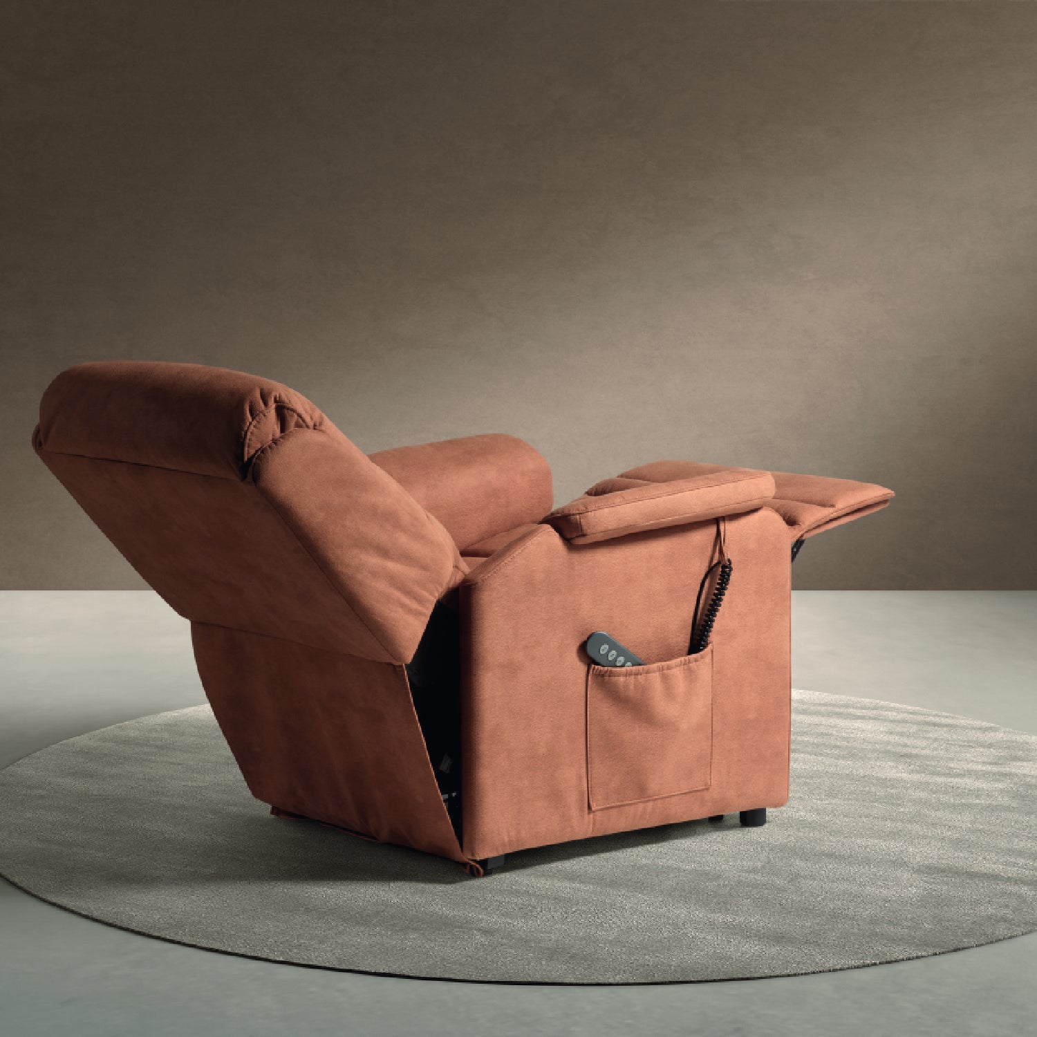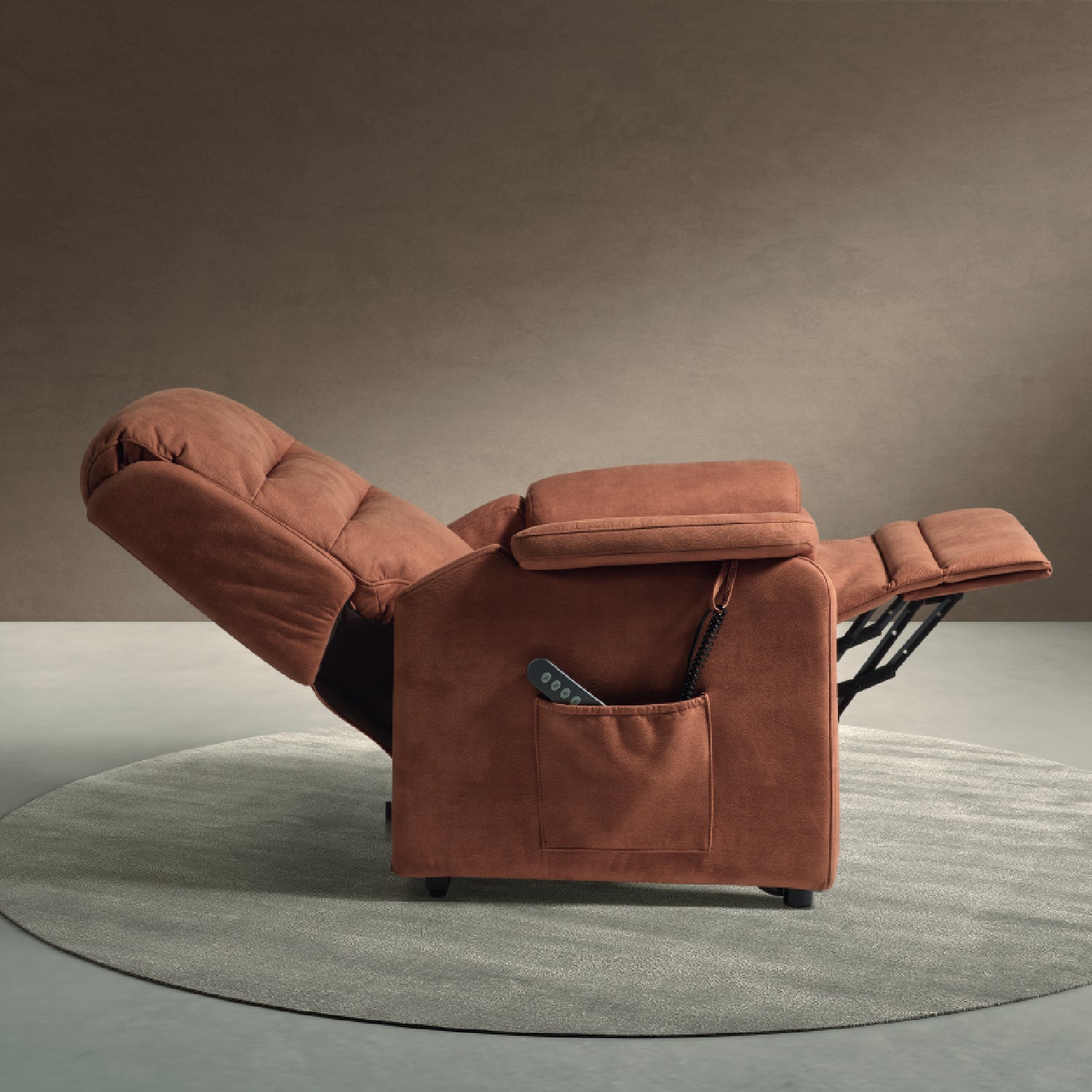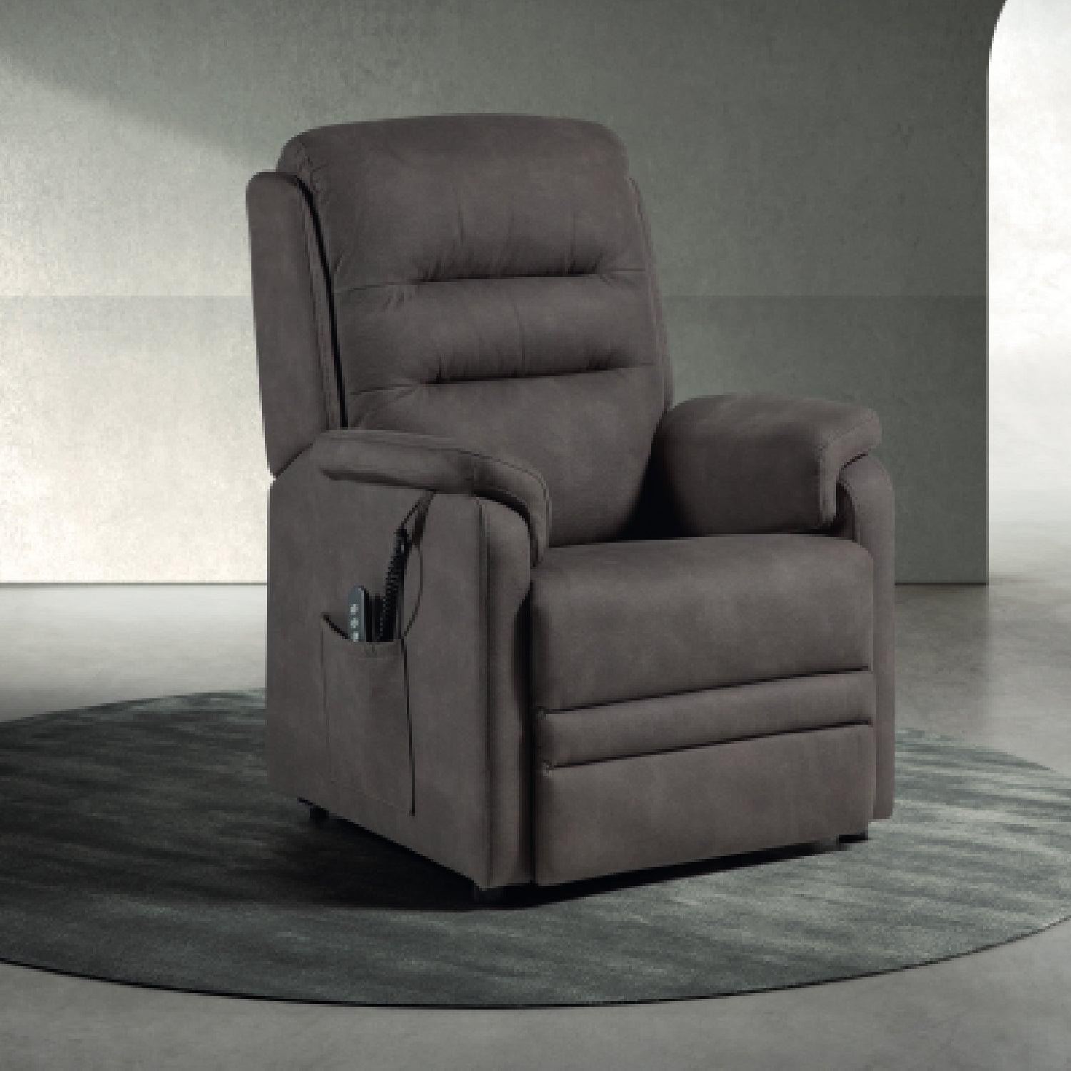Deze comfortabele relaxzetel combineert een zachte stoffering met geavanceerde functionaliteit om elke zitervaring te optimaliseren. Dankzij de geïntegreerde liftfunctie sta je moeiteloos recht — ideaal voor wie extra ondersteuning wenst.