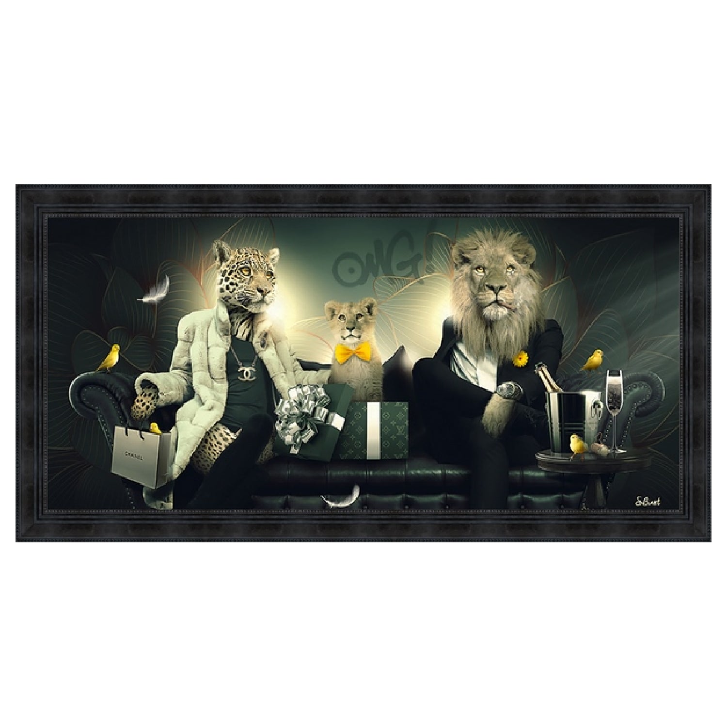 Dit unieke portret toont een stijlvolle dierenfamilie in een wereld van luxe en fantasie: