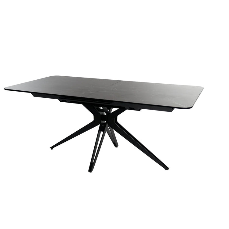 mm getemperd glas, bestand tegen krassen, vlekken en hitte door de 1200°Cbaktemperatuur. Dankzij het centrale zelfheffende verlengstuk van 50 cm transformeerthet formaat van 180 naar 230 cm in één vloeiende beweging. Het zwart metalen onderstel geeft de tafel een strakke look, terwijl je kan kiezen uit vier keramiekkleuren: Anthracite, Black Veined, White Veined en Natural Oak. Ideaal voor wie compact woont maar graag groots tafelt.