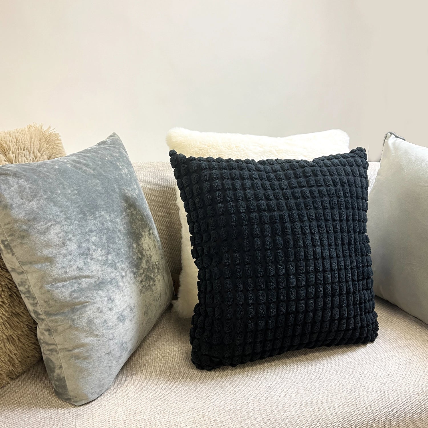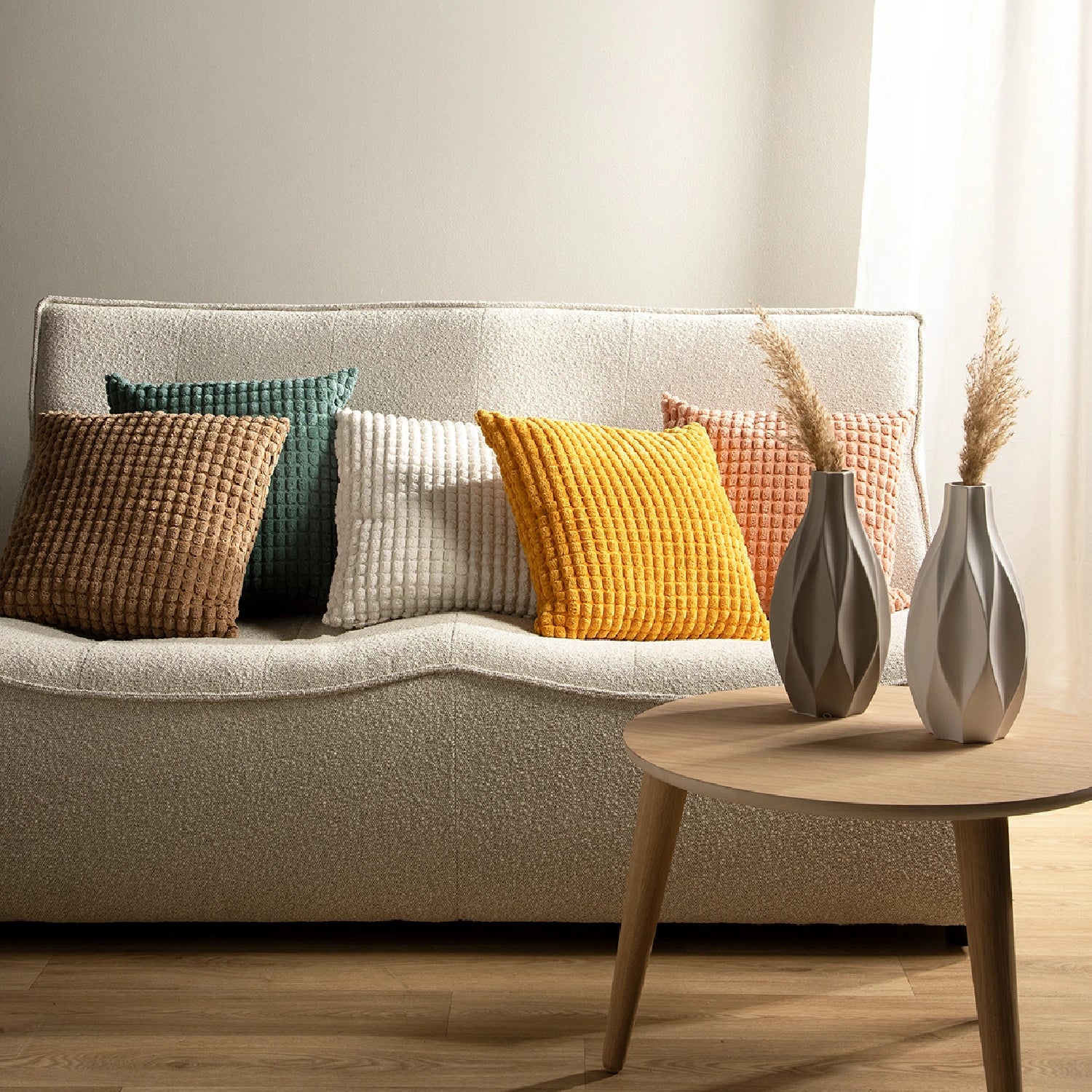 Dit kussen combineert tactiliteit met eenvoud in een eigentijds ontwerp. De opvallende 3D-blokstructuur op de voorzijde zorgt voor een rijk spel van licht en schaduw, terwijl het zachte oppervlak uitnodigt tot aanraken. De stof voelt royaal aan en biedt visuele diepte zonder druk te zijn — perfect voor moderne en warme interieurs.