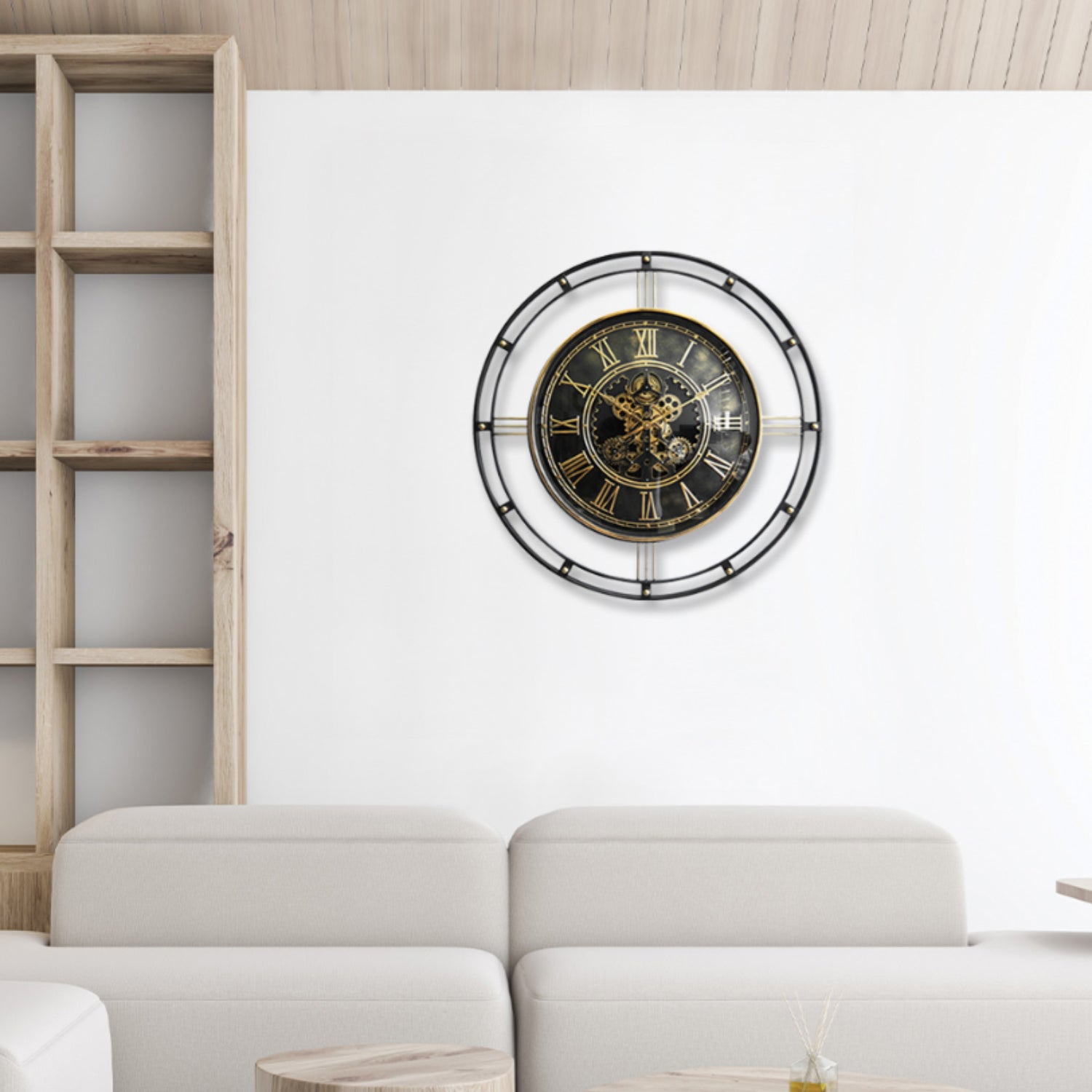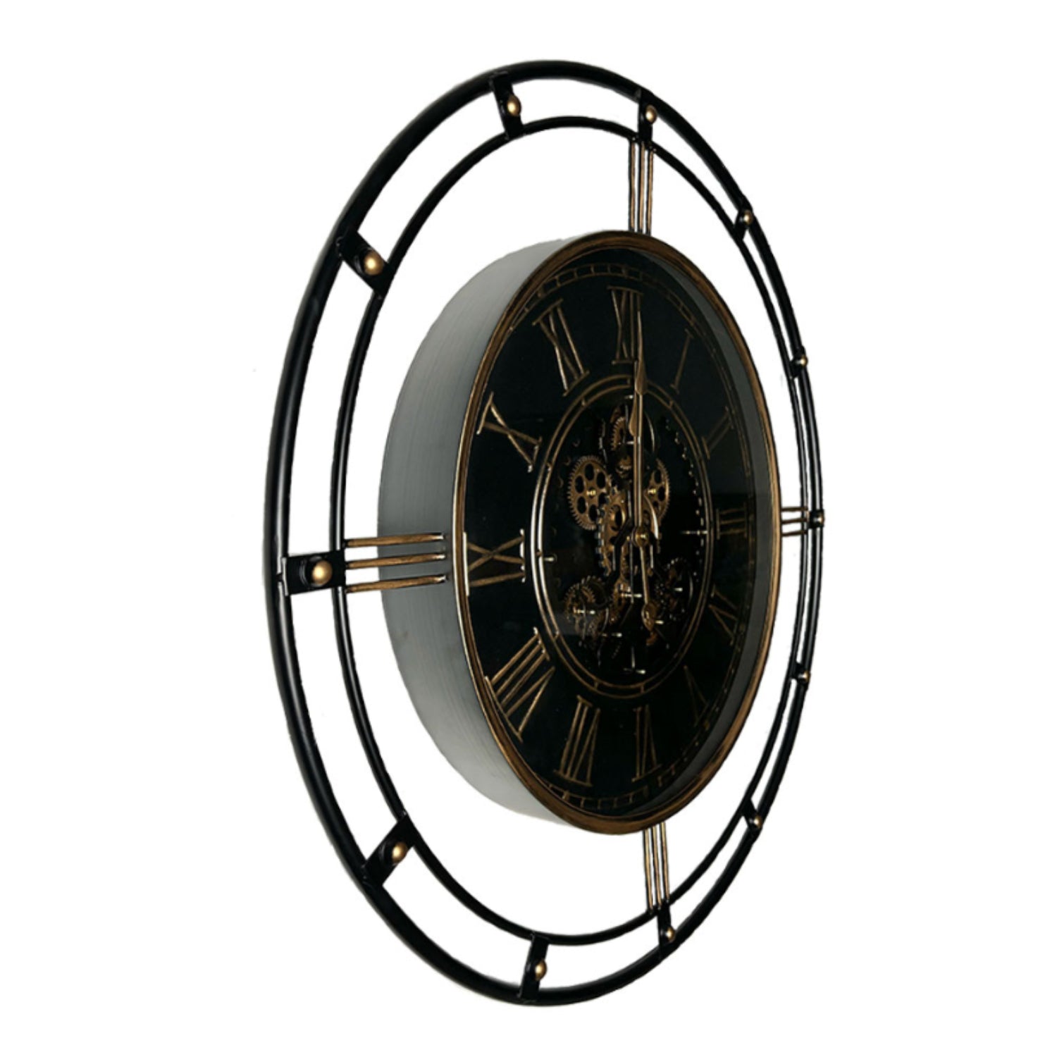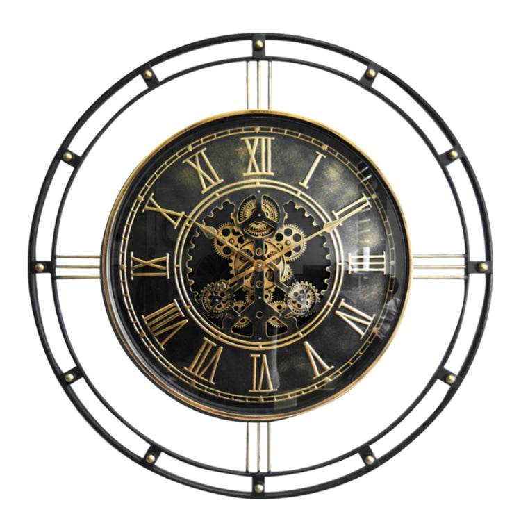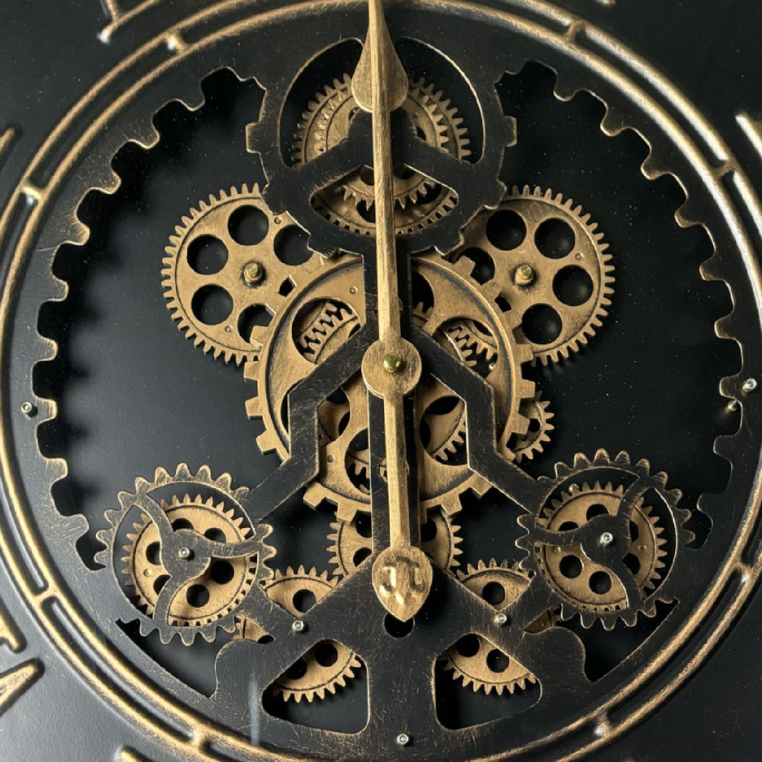 De zichtbare, bewegende tandwielen zijn verfijnd afgewerkt en geven de klok een mechanische
