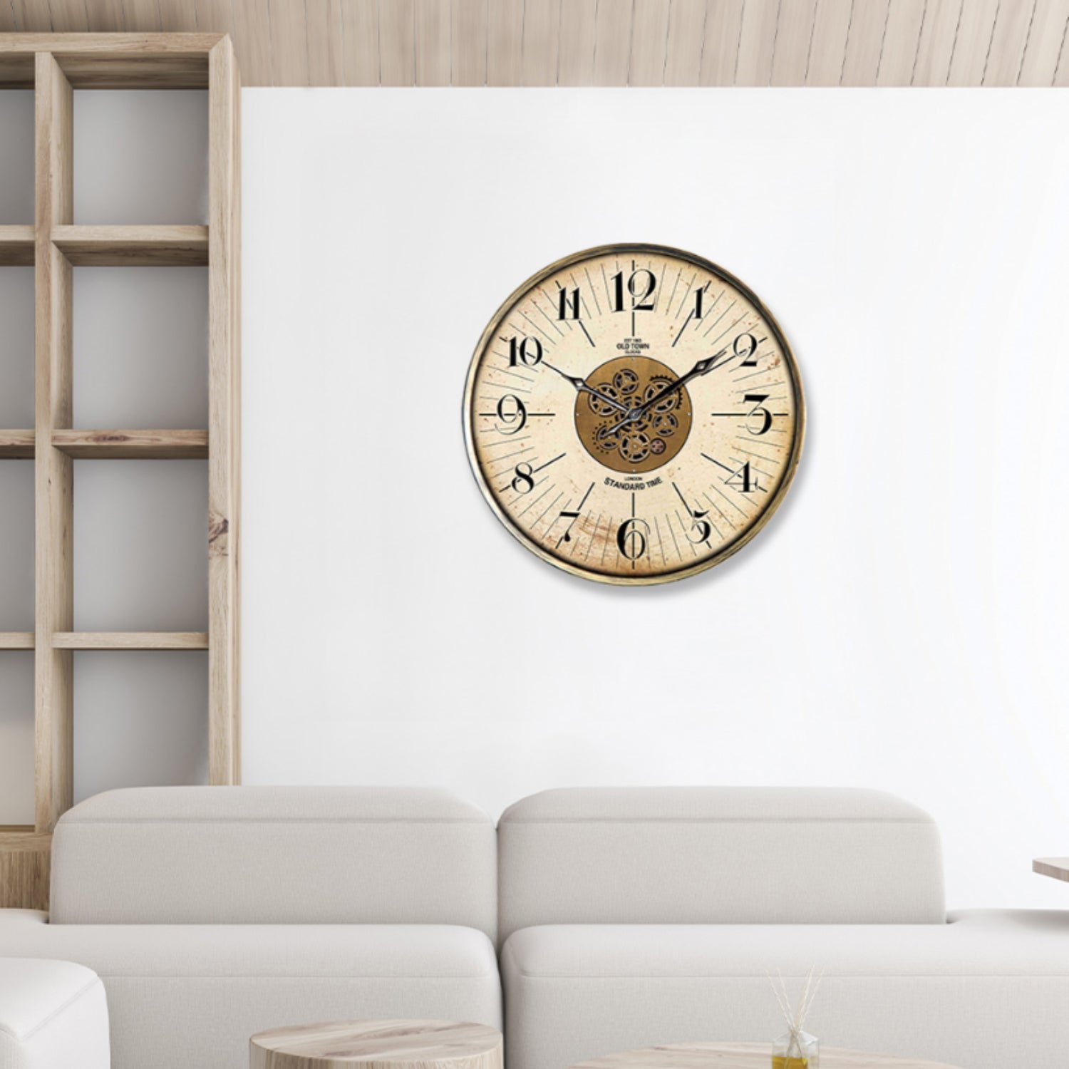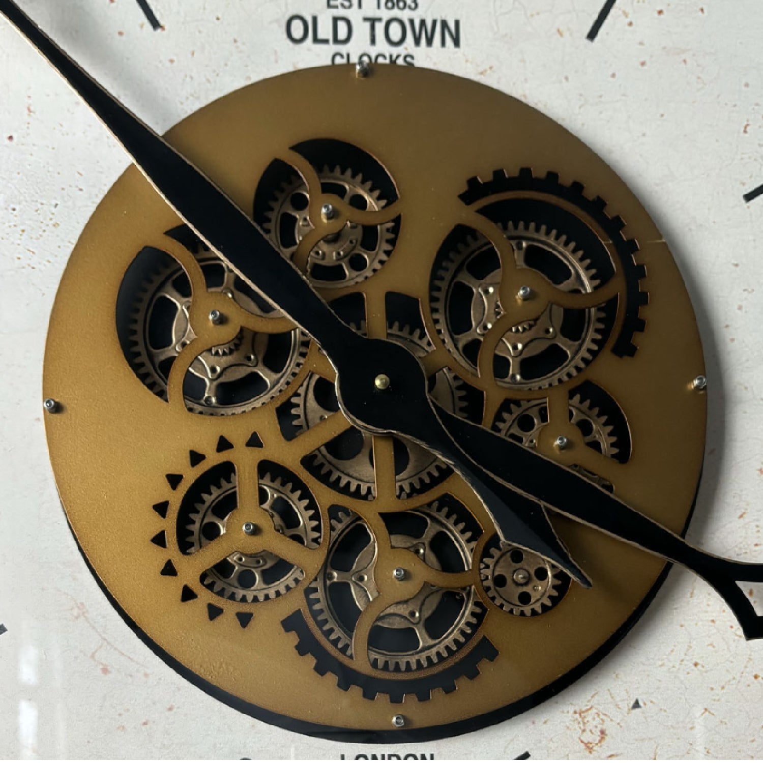 bronzen tandwielen achter glas, als een stil mechanisch hart. De diepzwarte cijfers