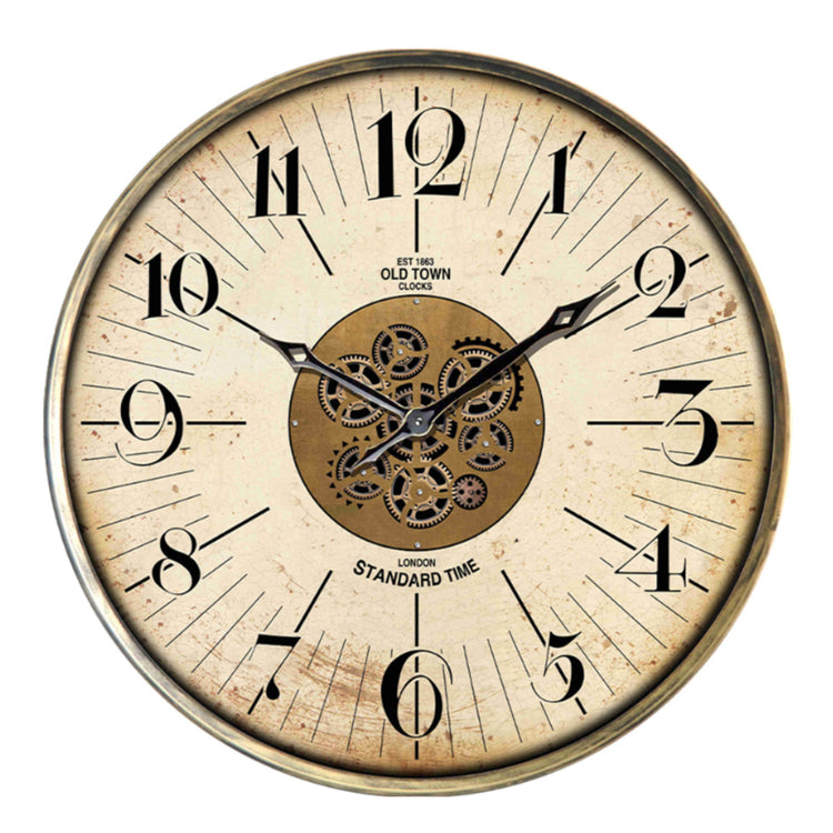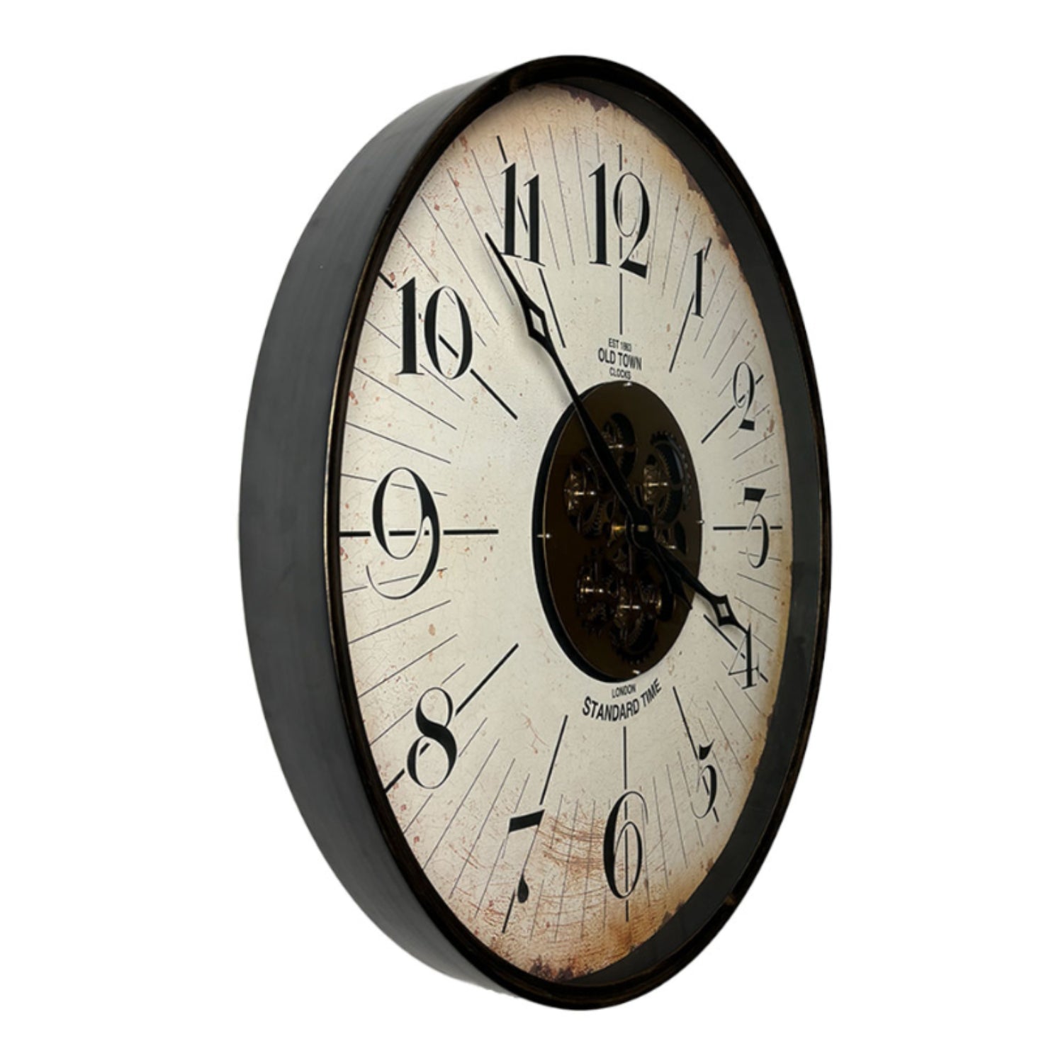 Deze klok van 80 cm trekt de aandacht met zijn zachte, verweerde wijzerplaat, alsof hij