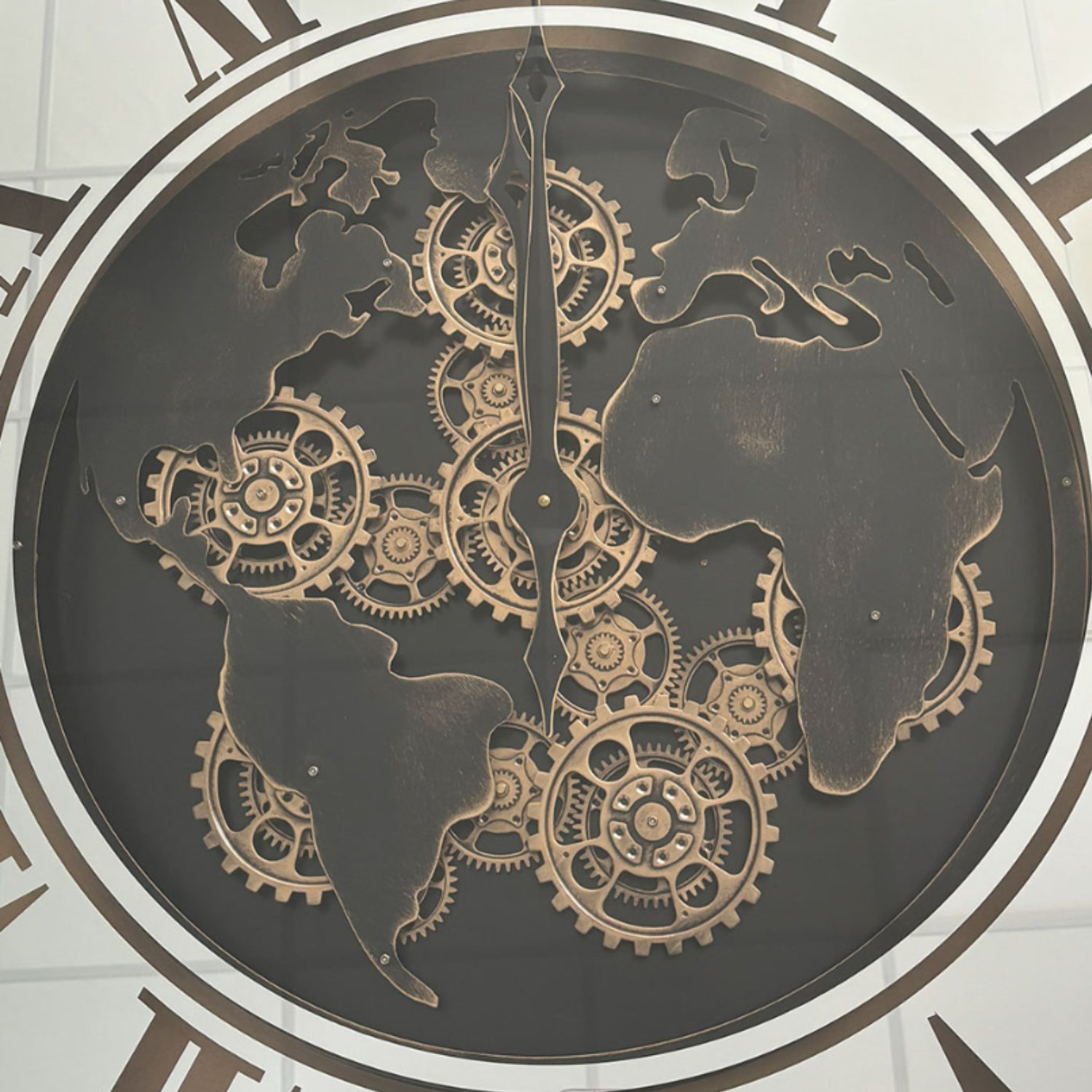 wereldkaart met fijne goudkleurige tandwielen die als planeten in beweging