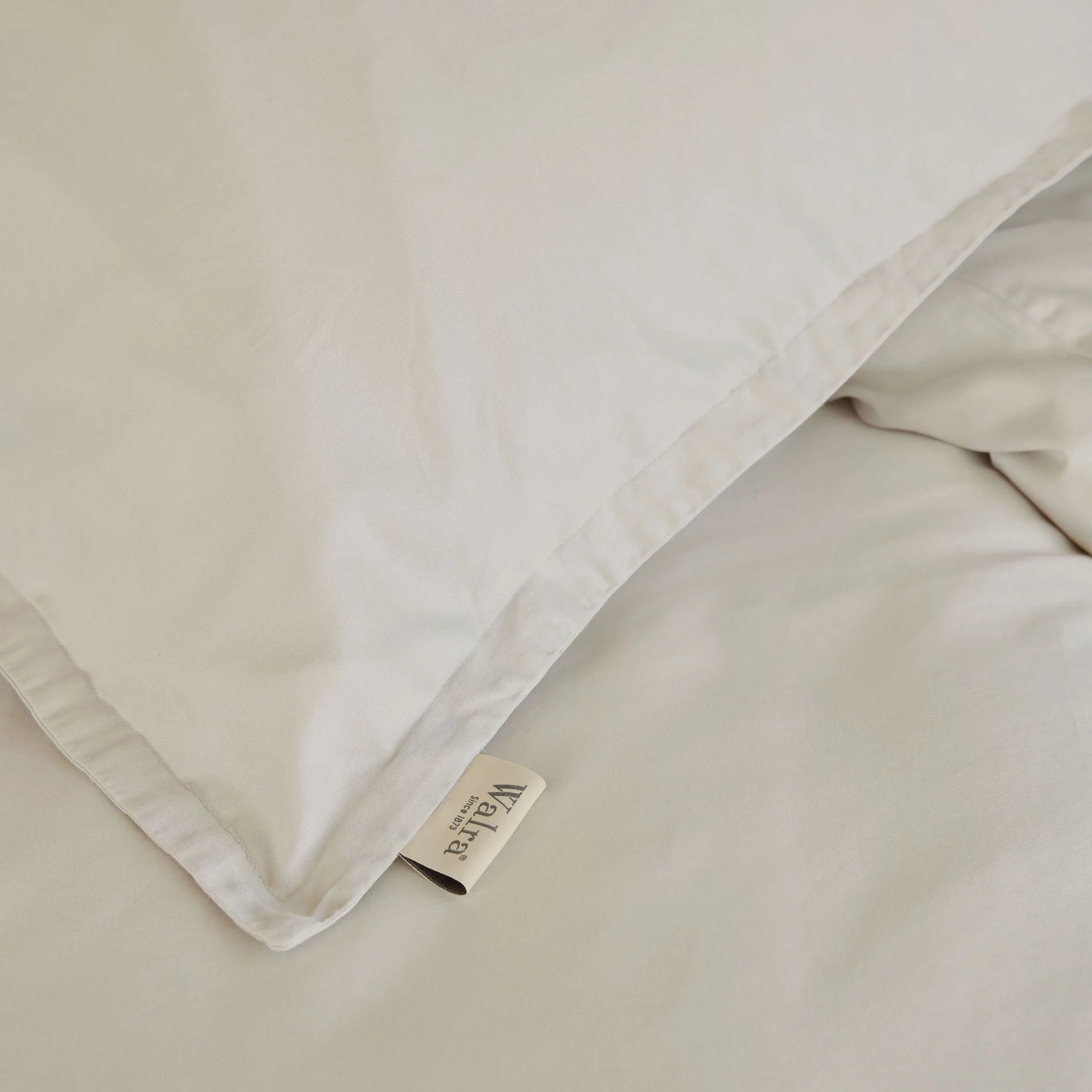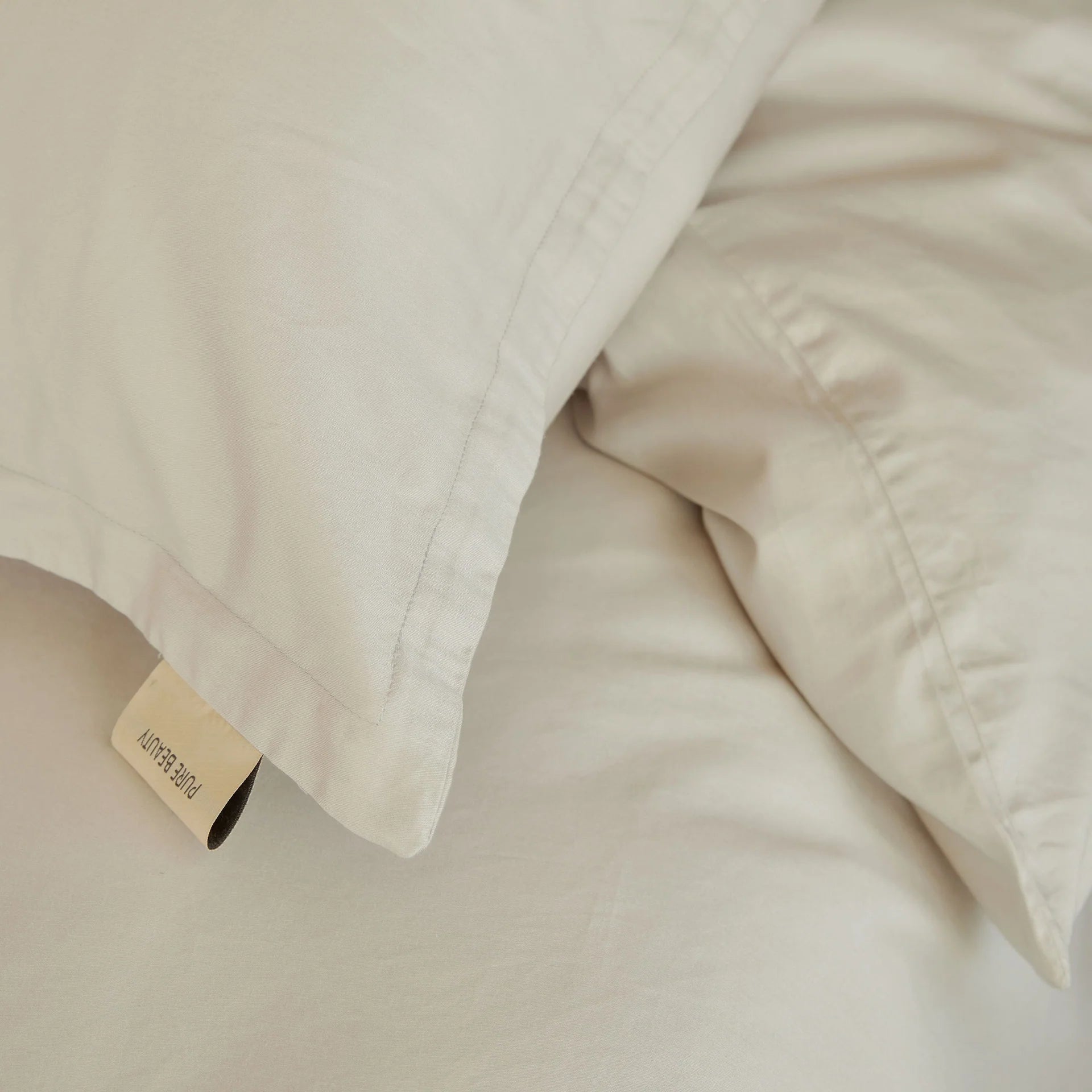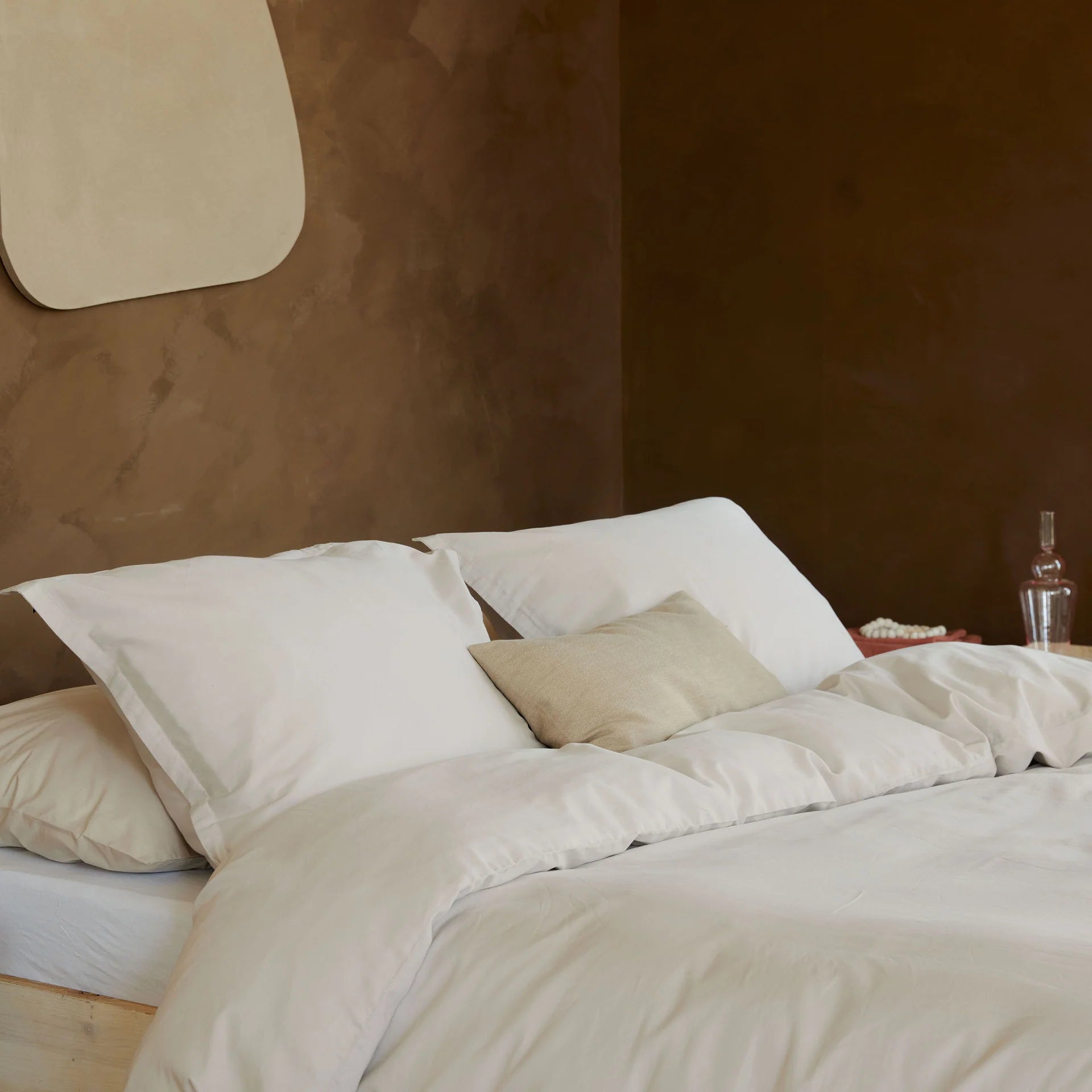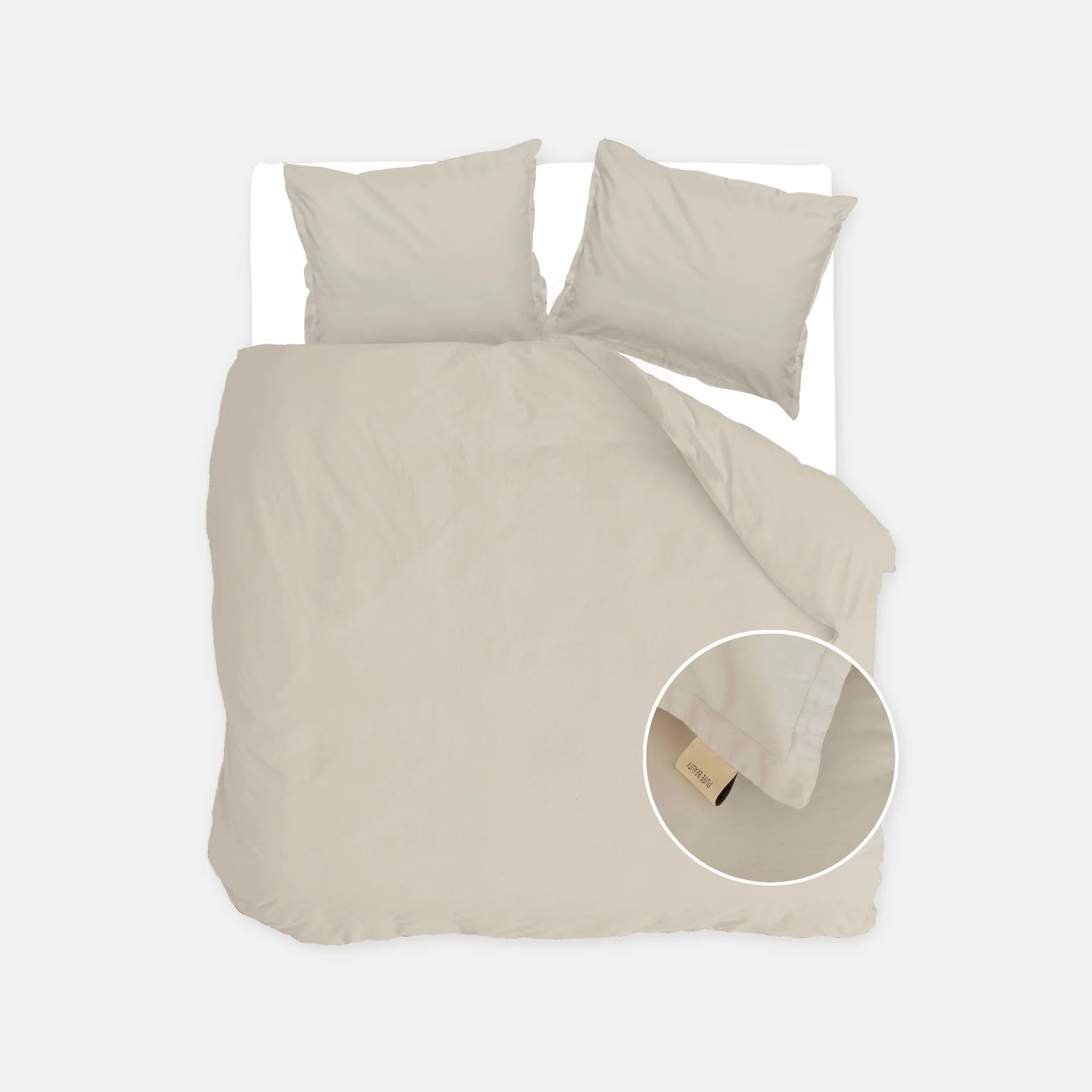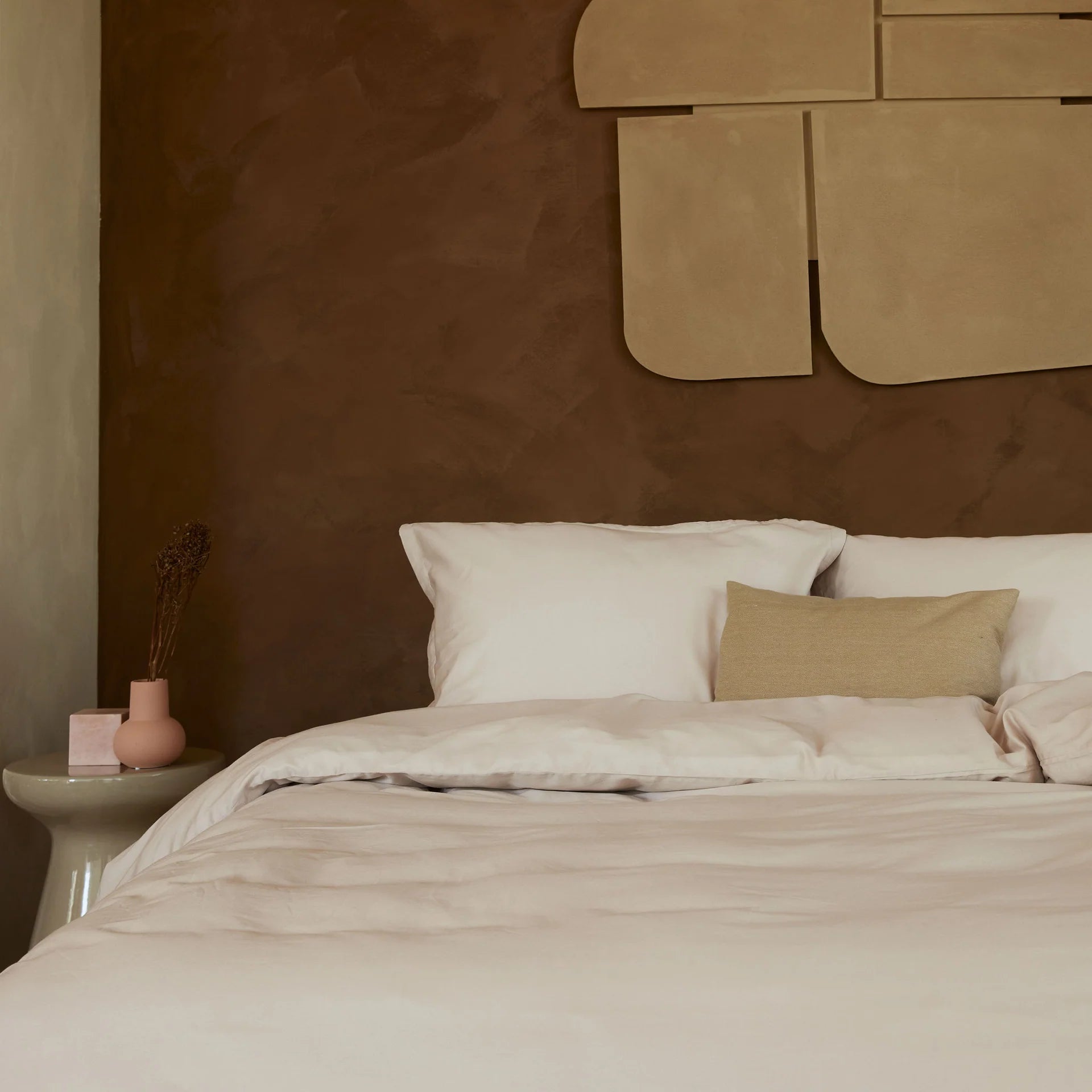 minimalistische ontwerp vormt een zachte harmonie tussen eenvoud en verfijning, terwijl de subtiele glans van het materiaal een vleugje geraffineerde glamour toevoegt. De lichte, zandkleurige tint straalt rust uit en wordt prachtig geaccentueerd door de natuurlijke kreukstructuur van de stof. Dit zorgt ervoor dat het ontwerp tijdloos en authentiek aanvoelt, perfect passend binnen een eigentijdse slaapkamer waarin comfort en sereniteit centraal staan.